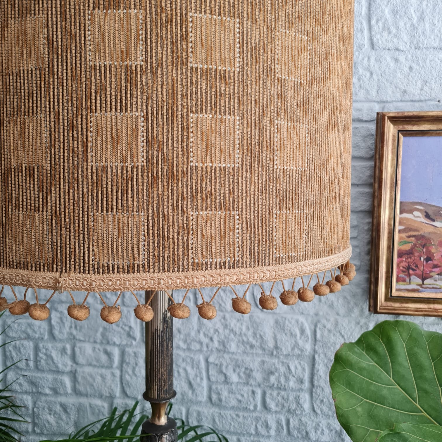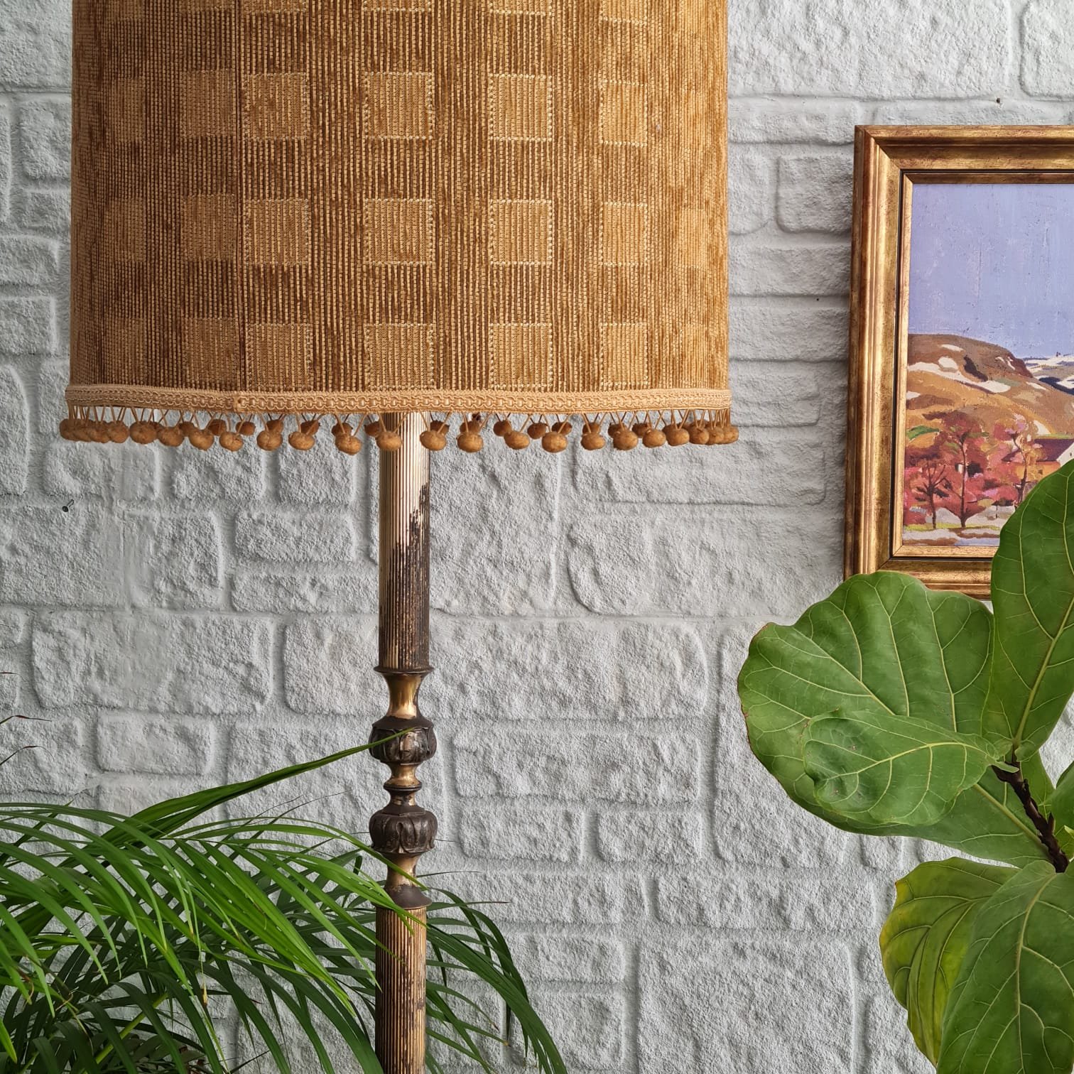 Üzerindeki kumaş kaplama şapkası orijinal. Saçaklı kenar detayıyla birlikte lambaderin bütünlüğünü tamamlıyor. Elektrik aksamı çalışır durumda.