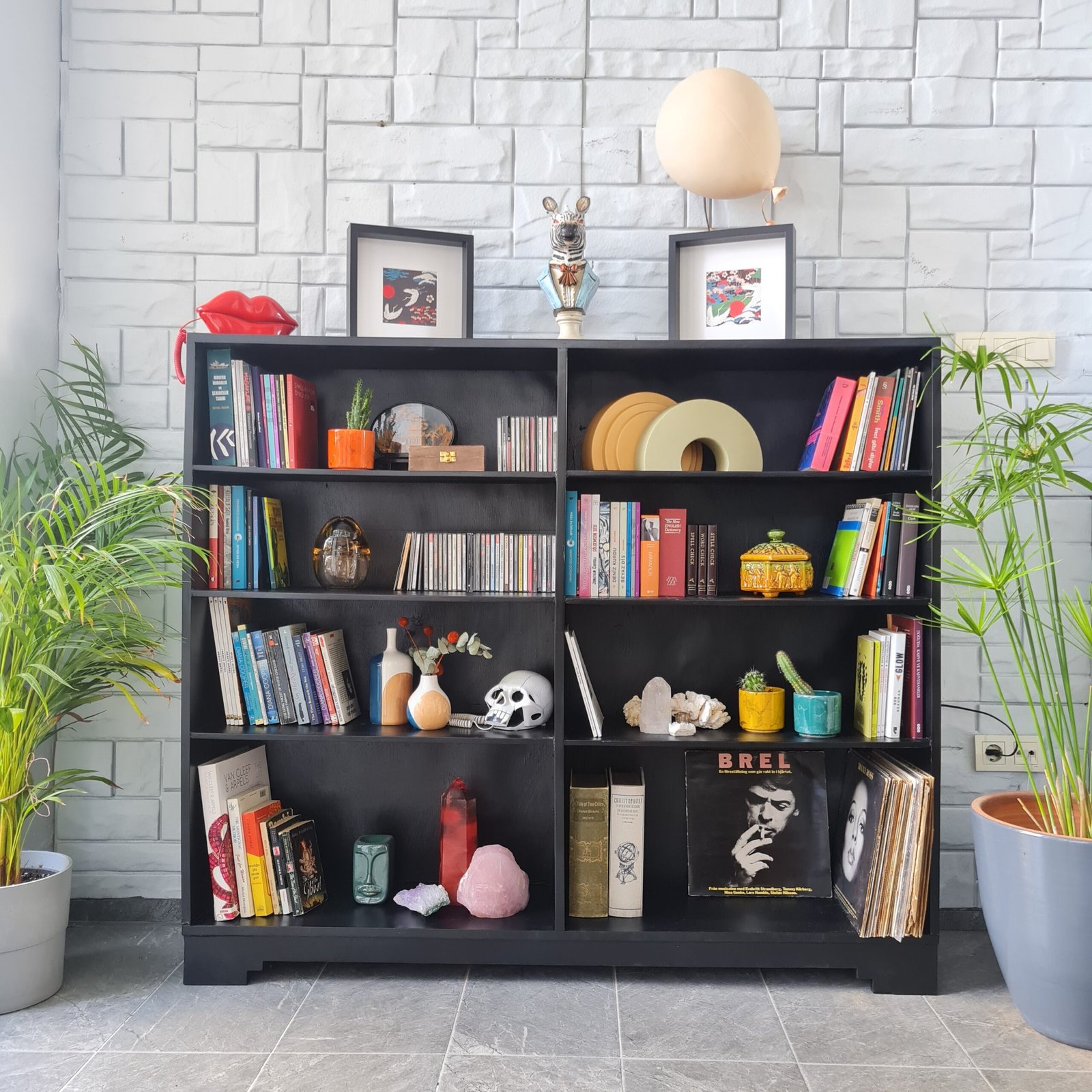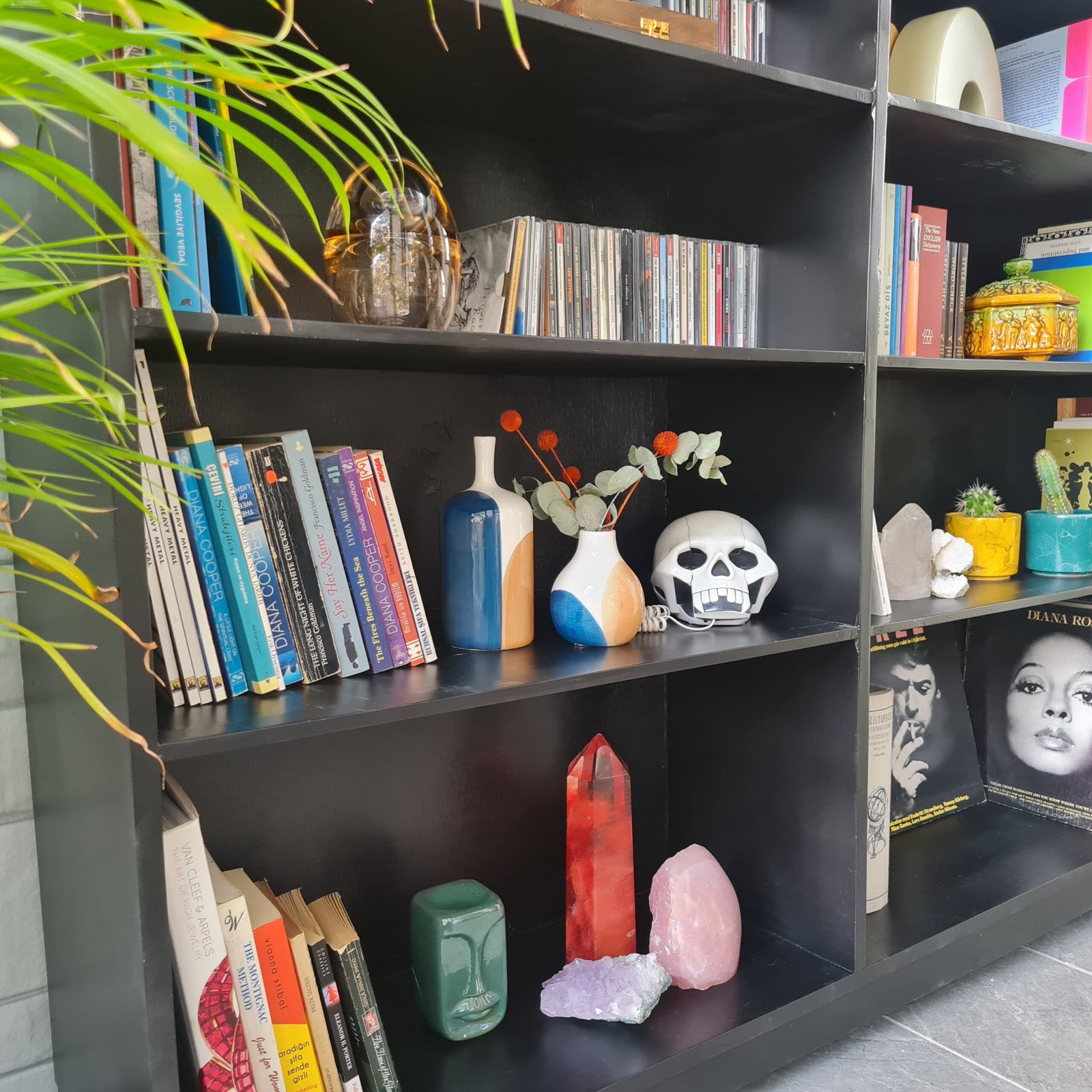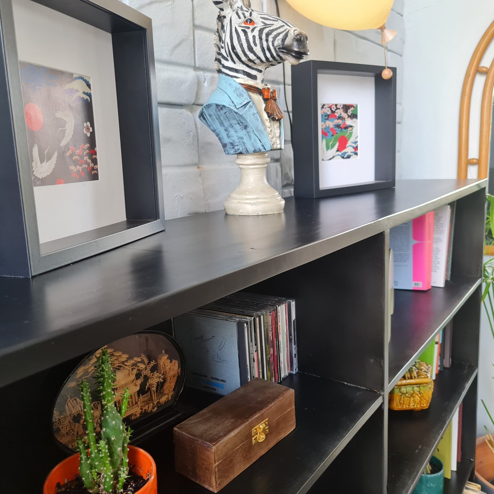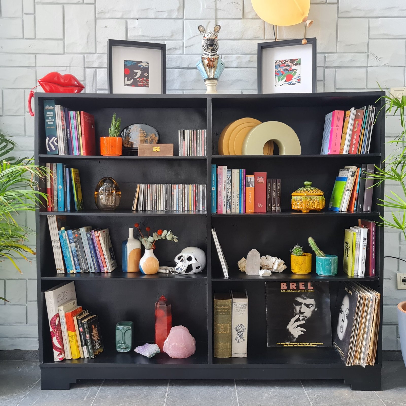 1940’larda üretilmiş masif ceviz kitaplık, sade ancak sıra dışı çizgilere sahip. Siyah lake boyası yenilendi ve modern bir dokunuş kazandı.
