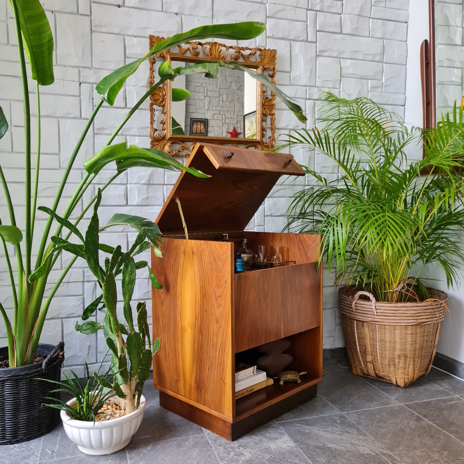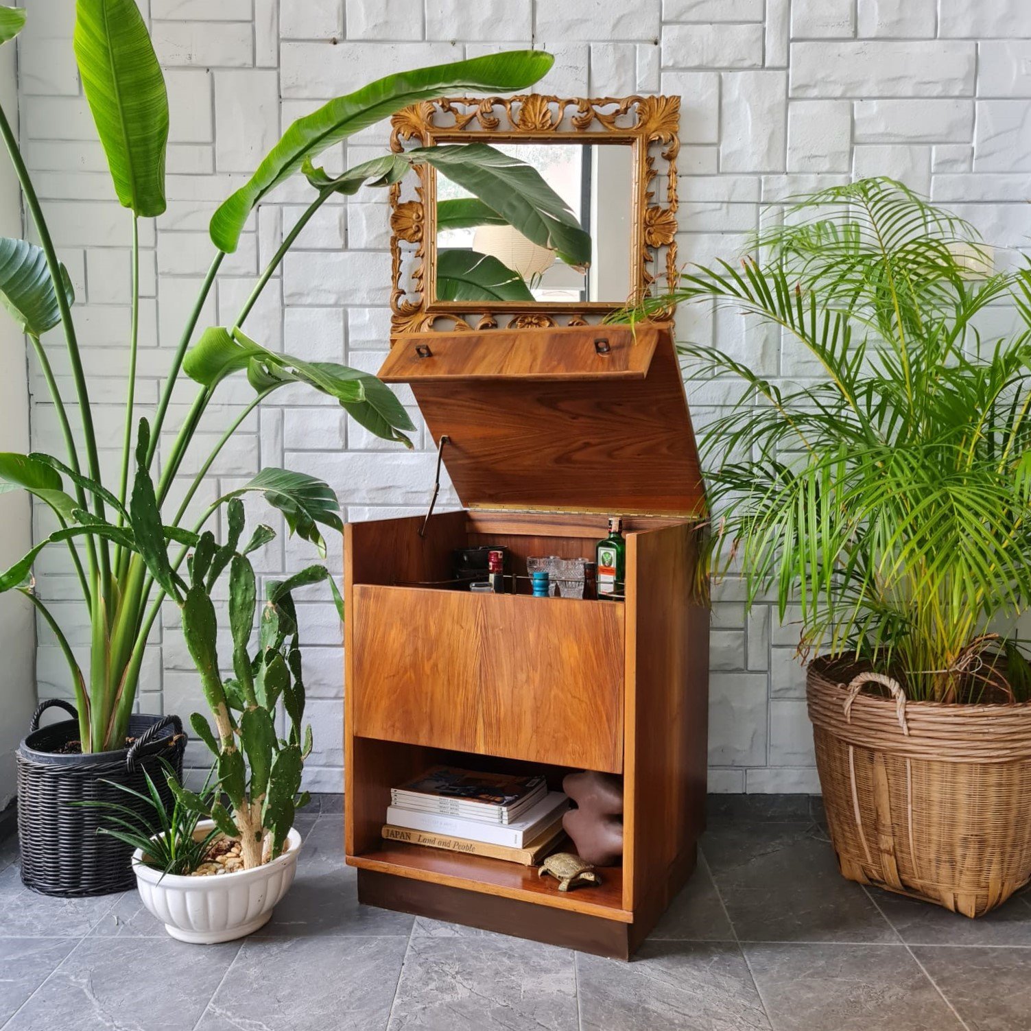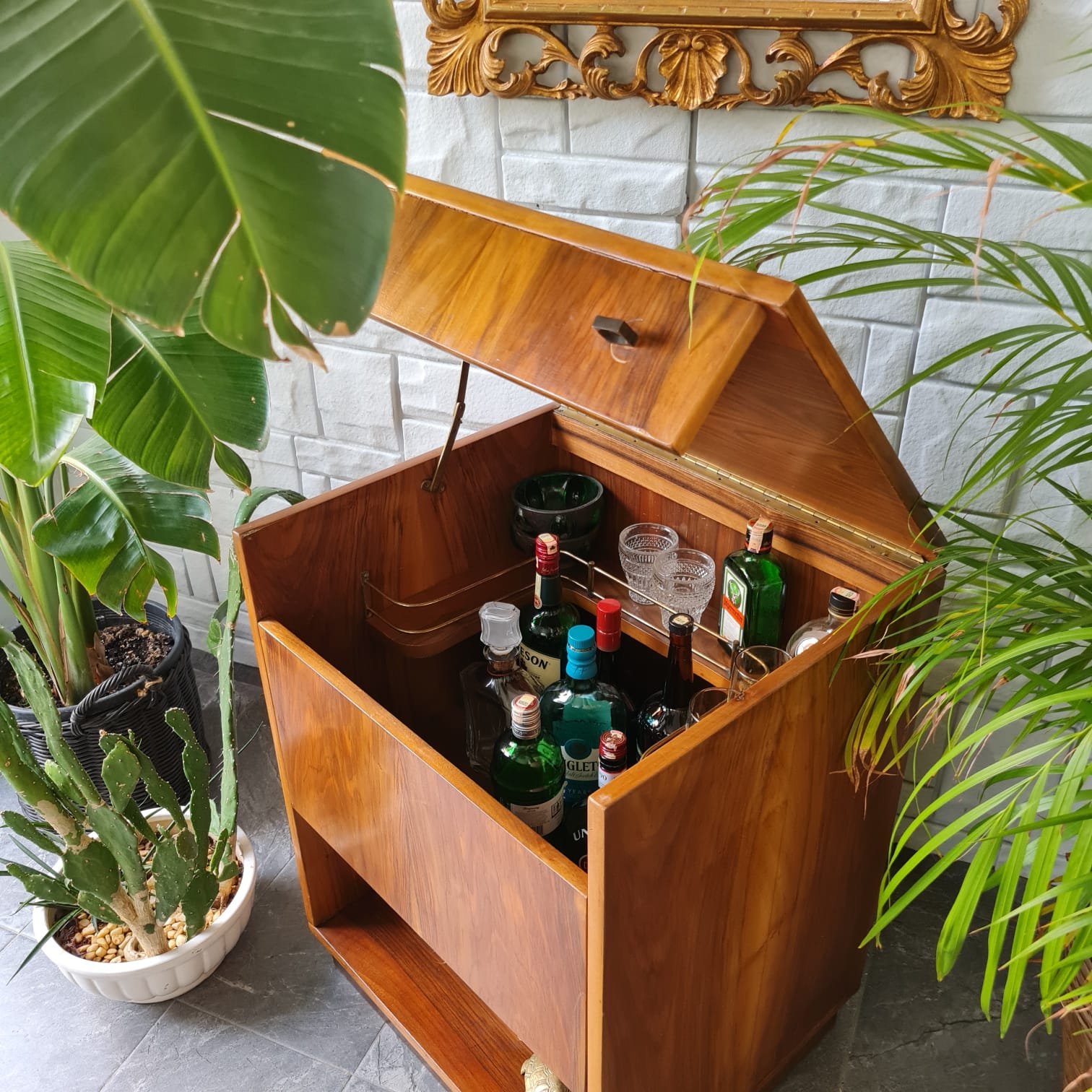 Üstten açılır kapaklı formu ve iç bölümdeki şişe düzeniyle döneminin kompakt bar dolabı tasarımını taşıyan kullanışlı bir parça. Kapak açıldığında servis alanı olarak da kullanılabilecek geniş bir iç hacim sunuyor. Alt bölümde yer alan açık raf günlük kullanım için ek depolama alanı sağlıyor.