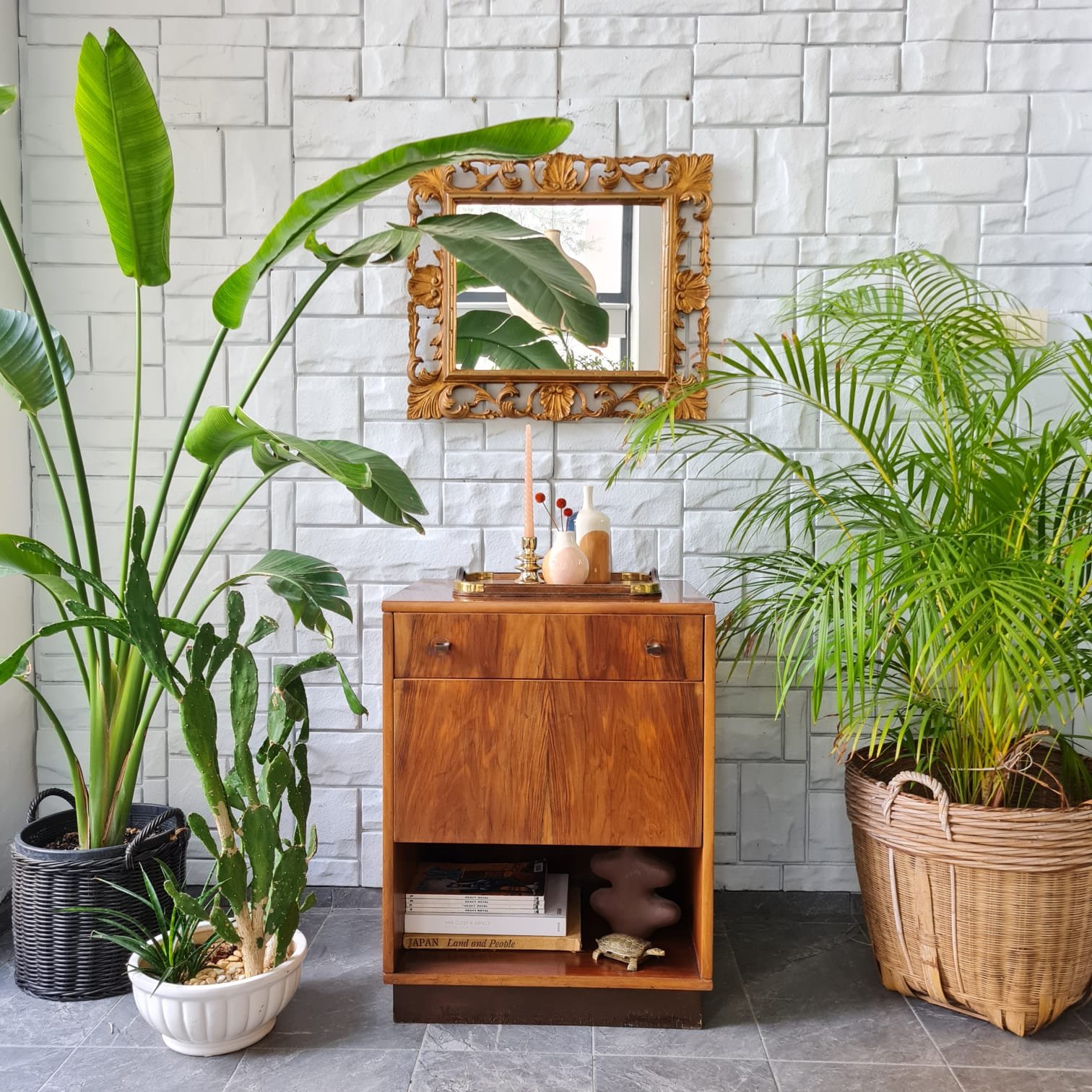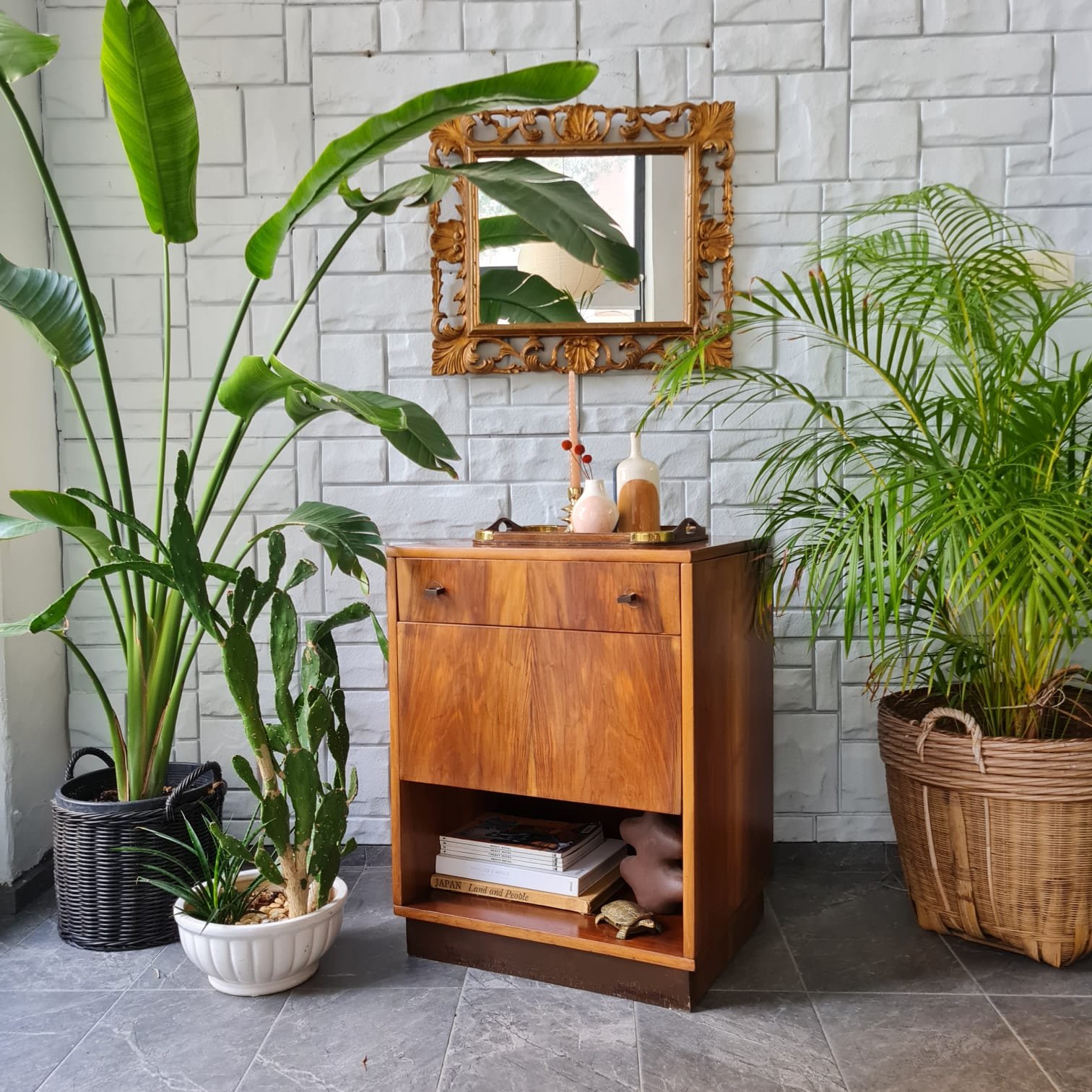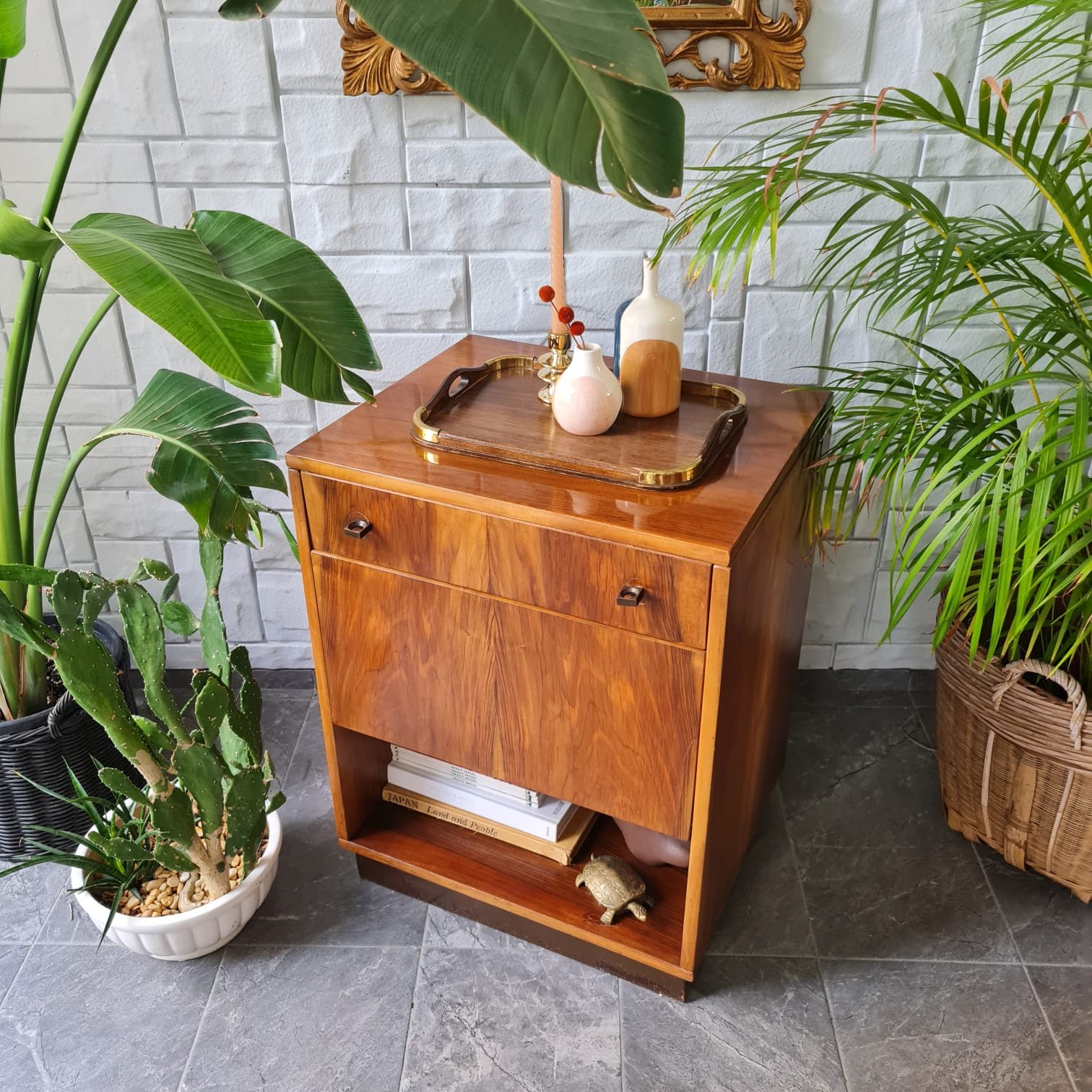 Üstten açılır kapaklı formu ve iç bölümdeki şişe düzeniyle döneminin kompakt bar dolabı tasarımını taşıyan kullanışlı bir parça. Kapak açıldığında servis alanı olarak da kullanılabilecek geniş bir iç hacim sunuyor. Alt bölümde yer alan açık raf günlük kullanım için ek depolama alanı sağlıyor.