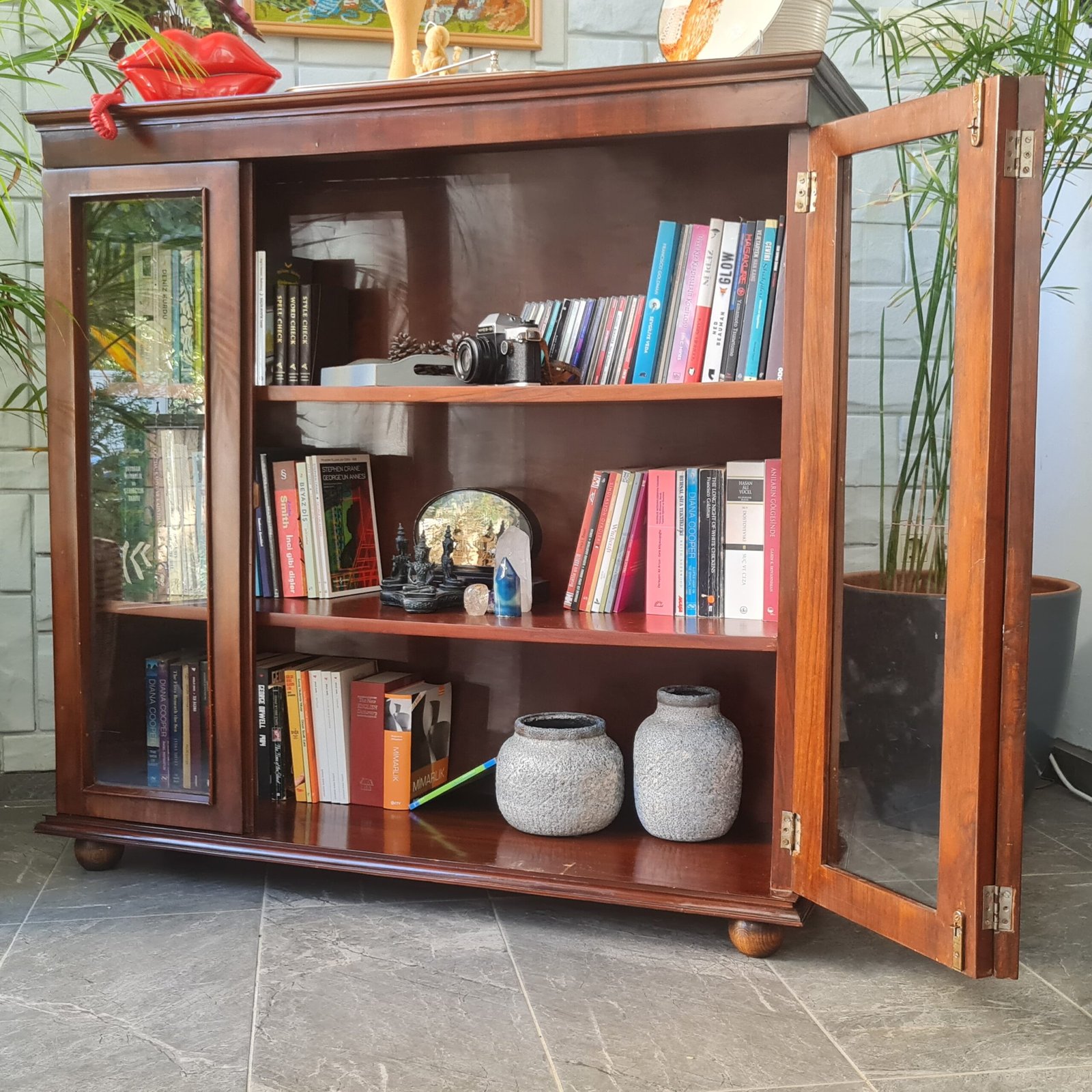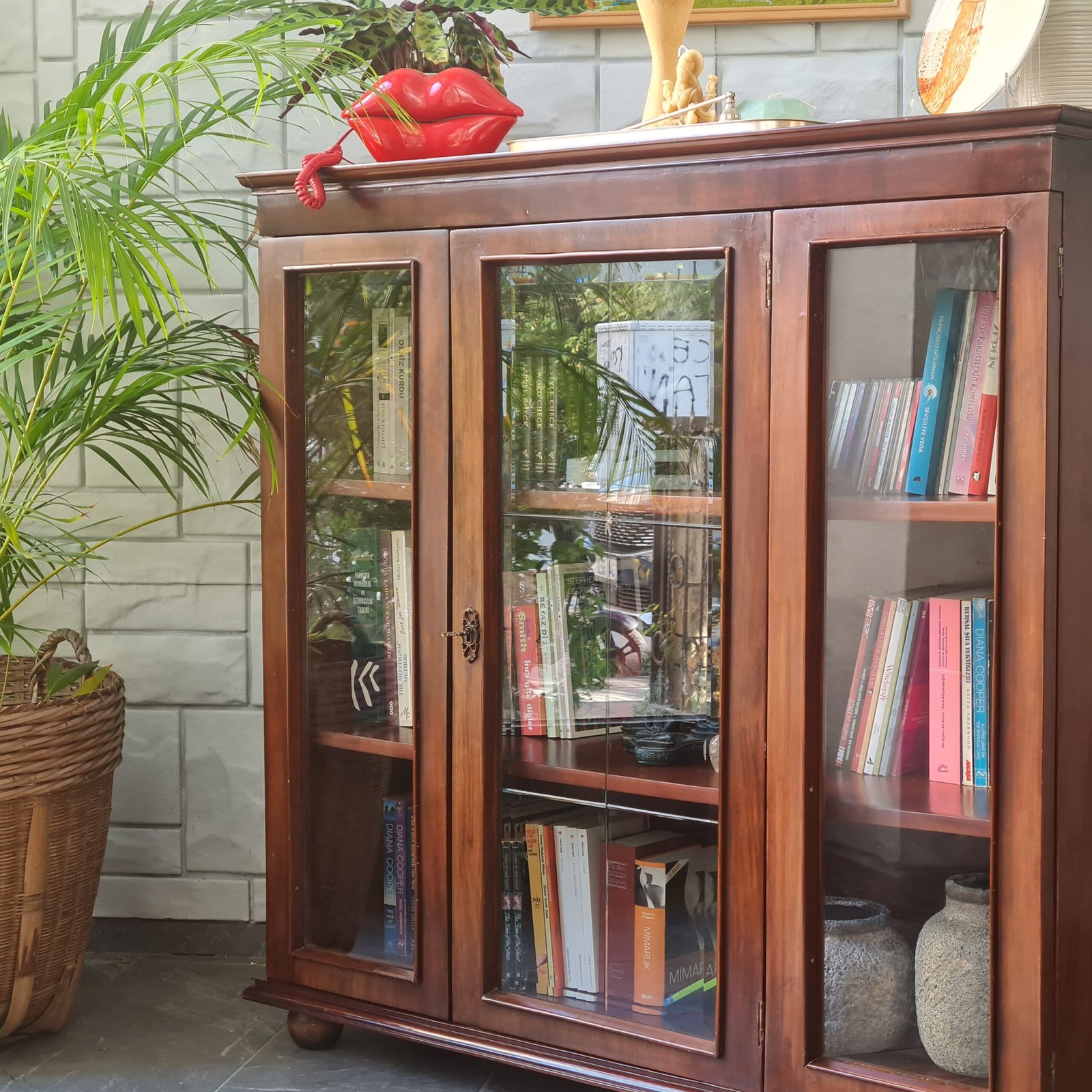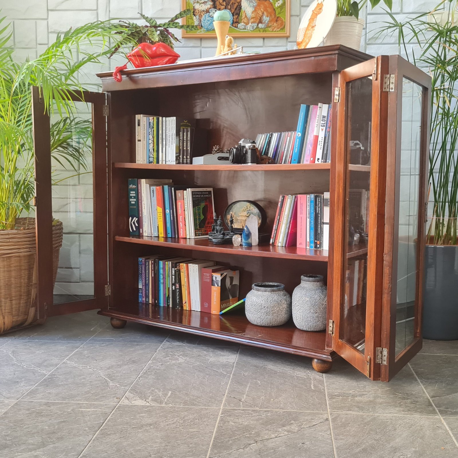 Son derece yüksek kondisyonda olan orijinal anahtarlı masif ceviz kitaplık, sağlam yapısı ile yıllarca kullanıma hazırdır. Bu benzersiz parça, evinize ya da ofisinize hem karakter katacak hem de depolama çözümünüz olacak.