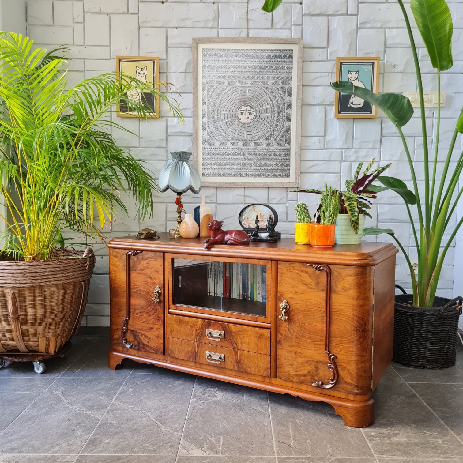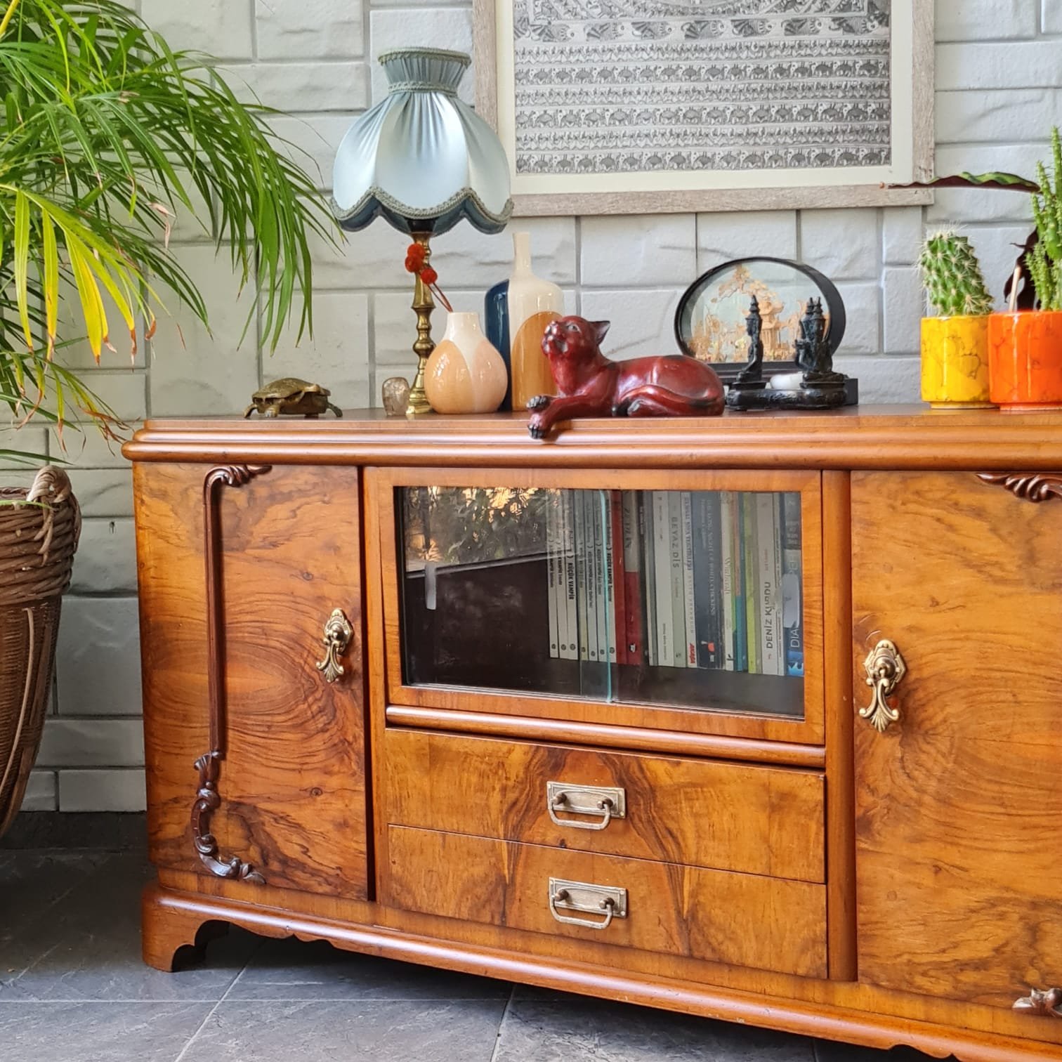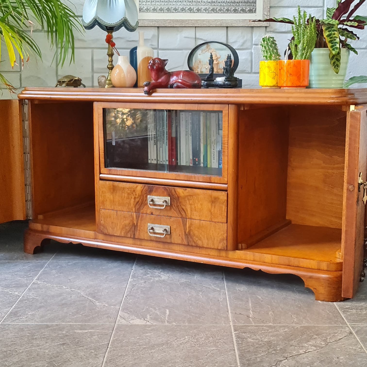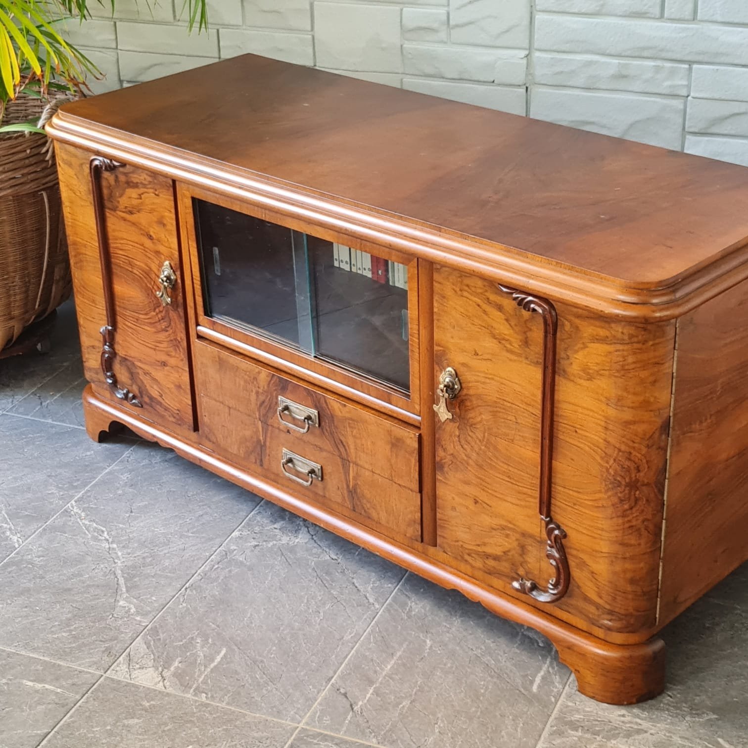 1960’larda üretilmiş tv ünitesi. Masif ceviz gövde üzerine kök ceviz kaplama. Ön yüzeydeki kaplama desenleri düzenli ve dengeli; ahşabın doğal yapısı net şekilde okunuyor.