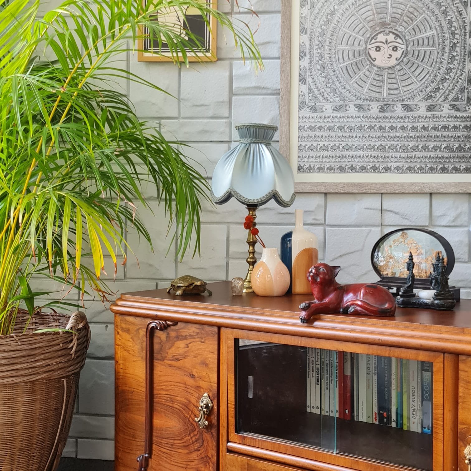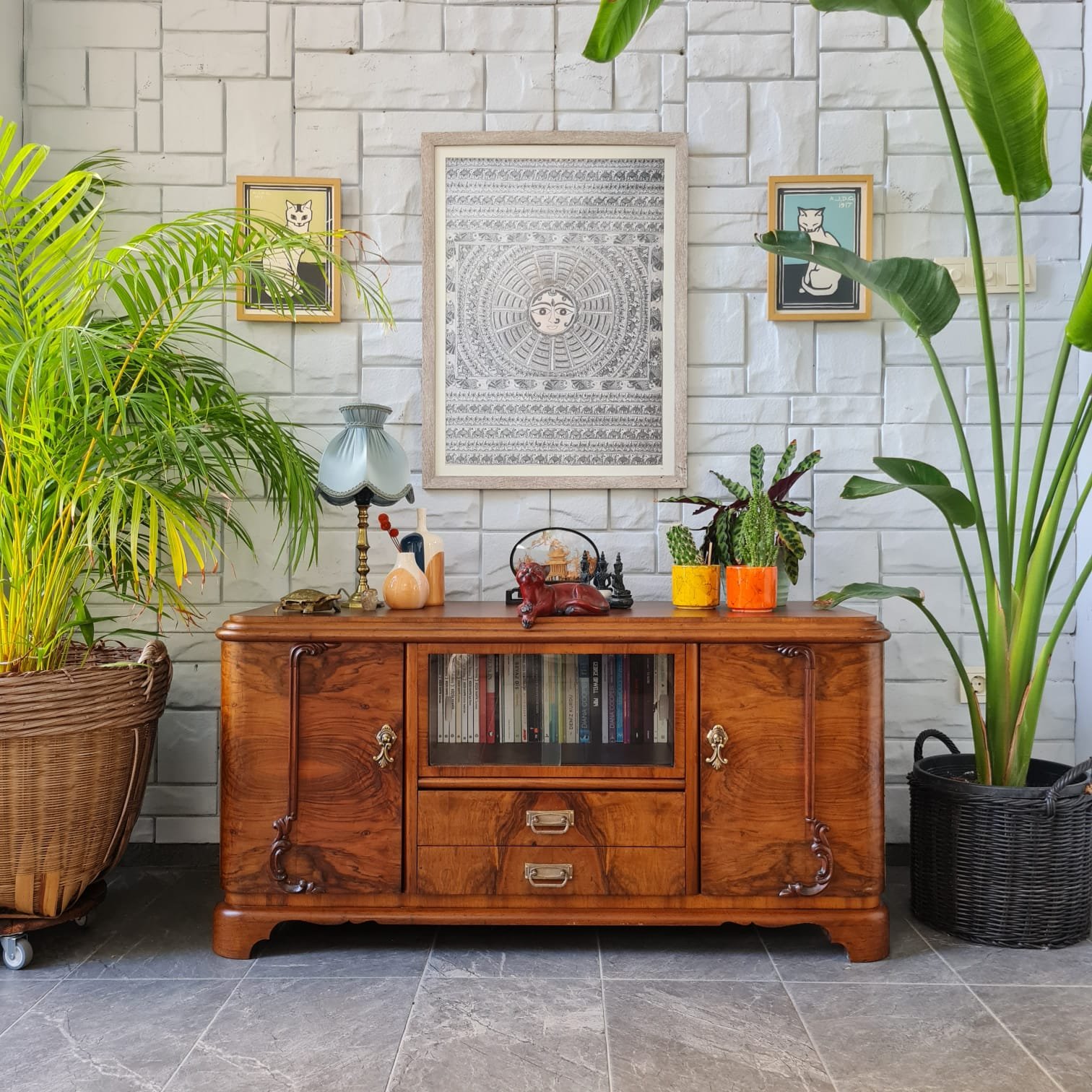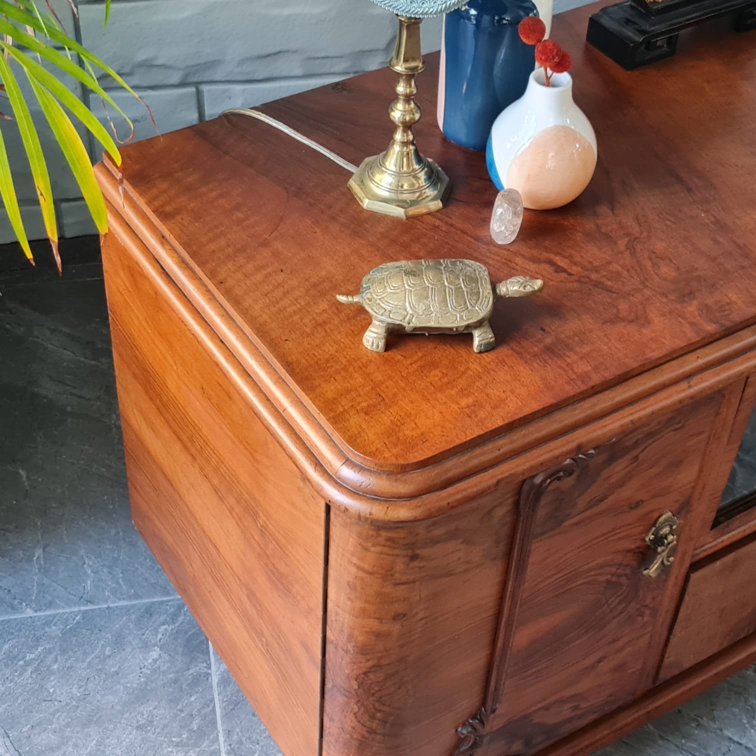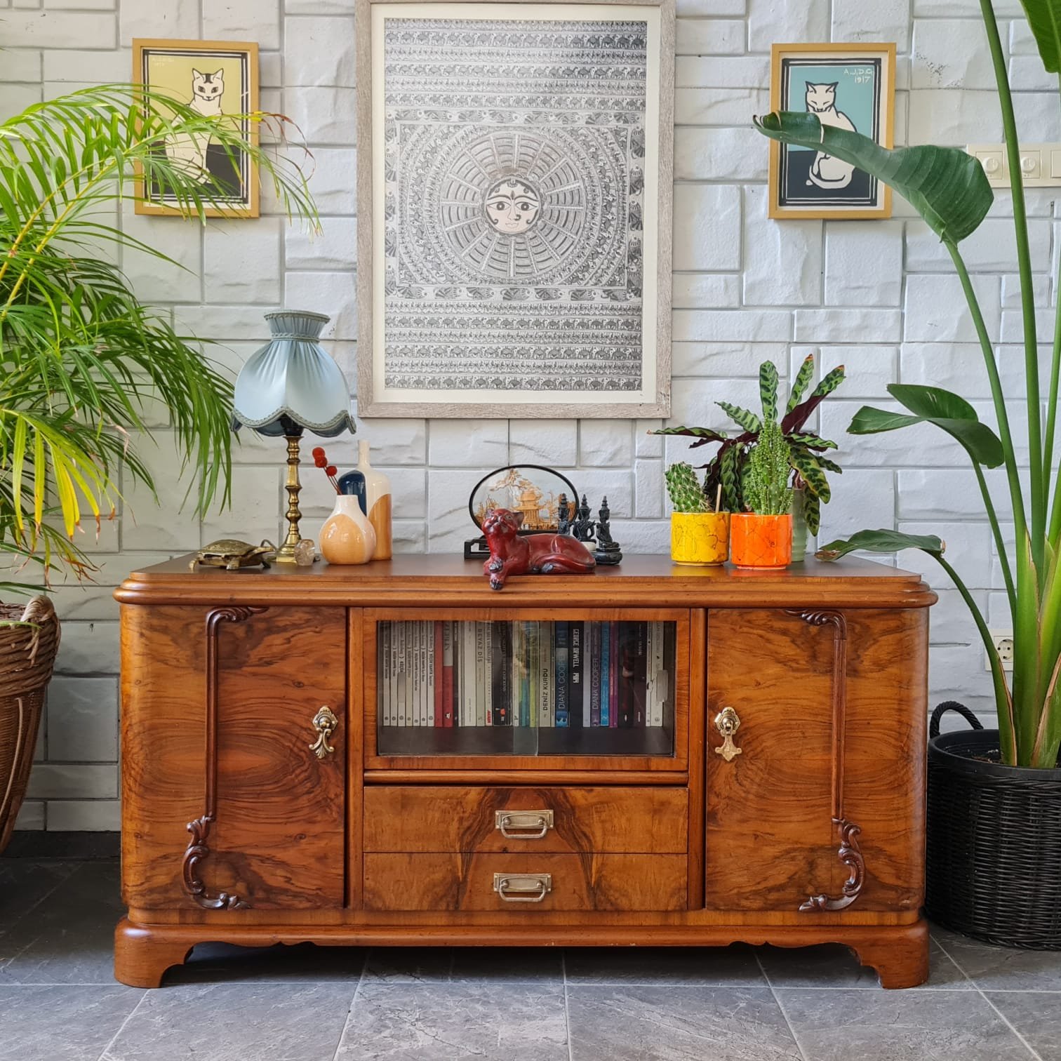 1960’larda üretilmiş tv ünitesi. Masif ceviz gövde üzerine kök ceviz kaplama. Ön yüzeydeki kaplama desenleri düzenli ve dengeli; ahşabın doğal yapısı net şekilde okunuyor.