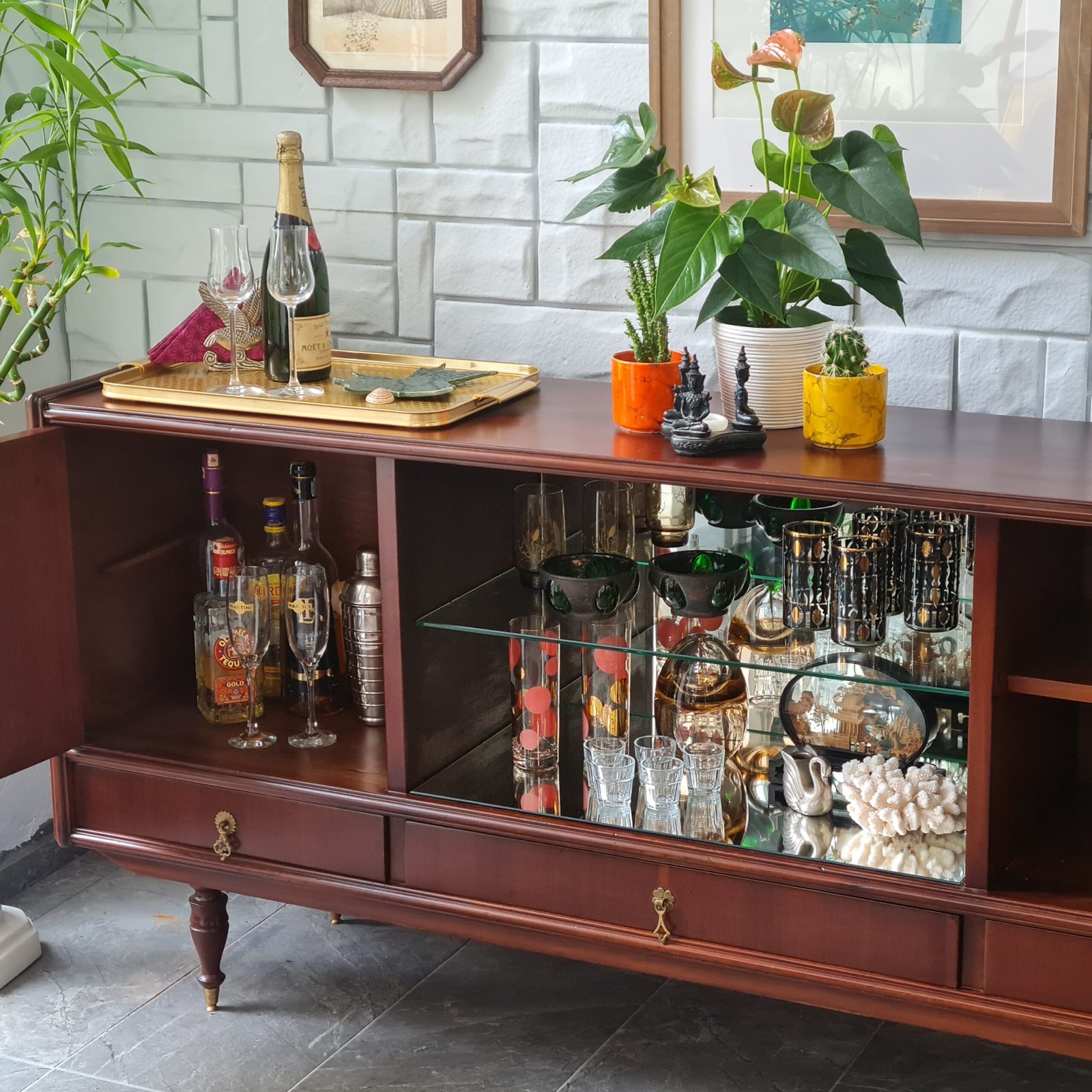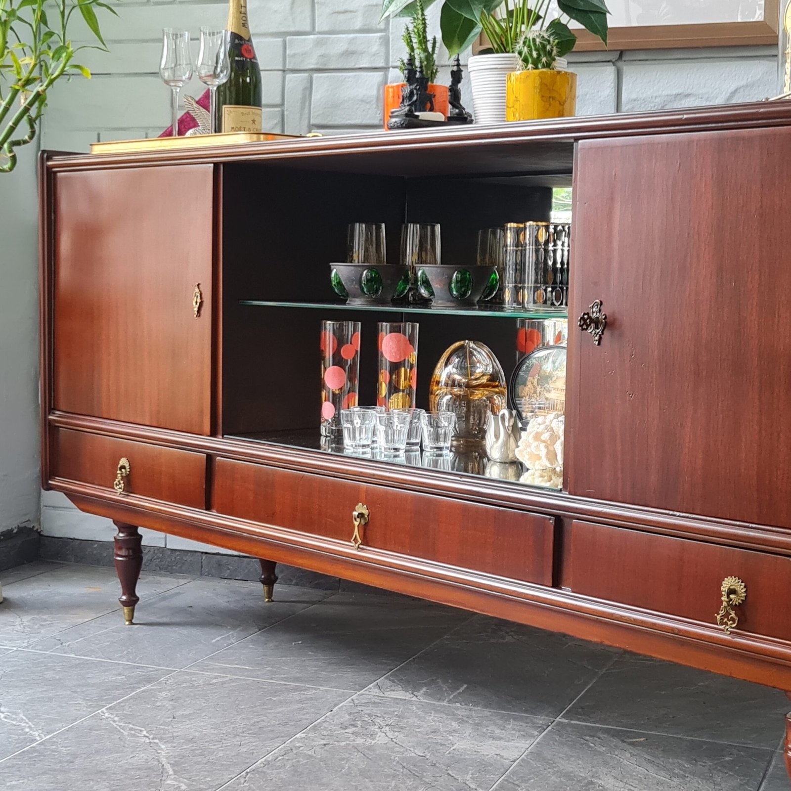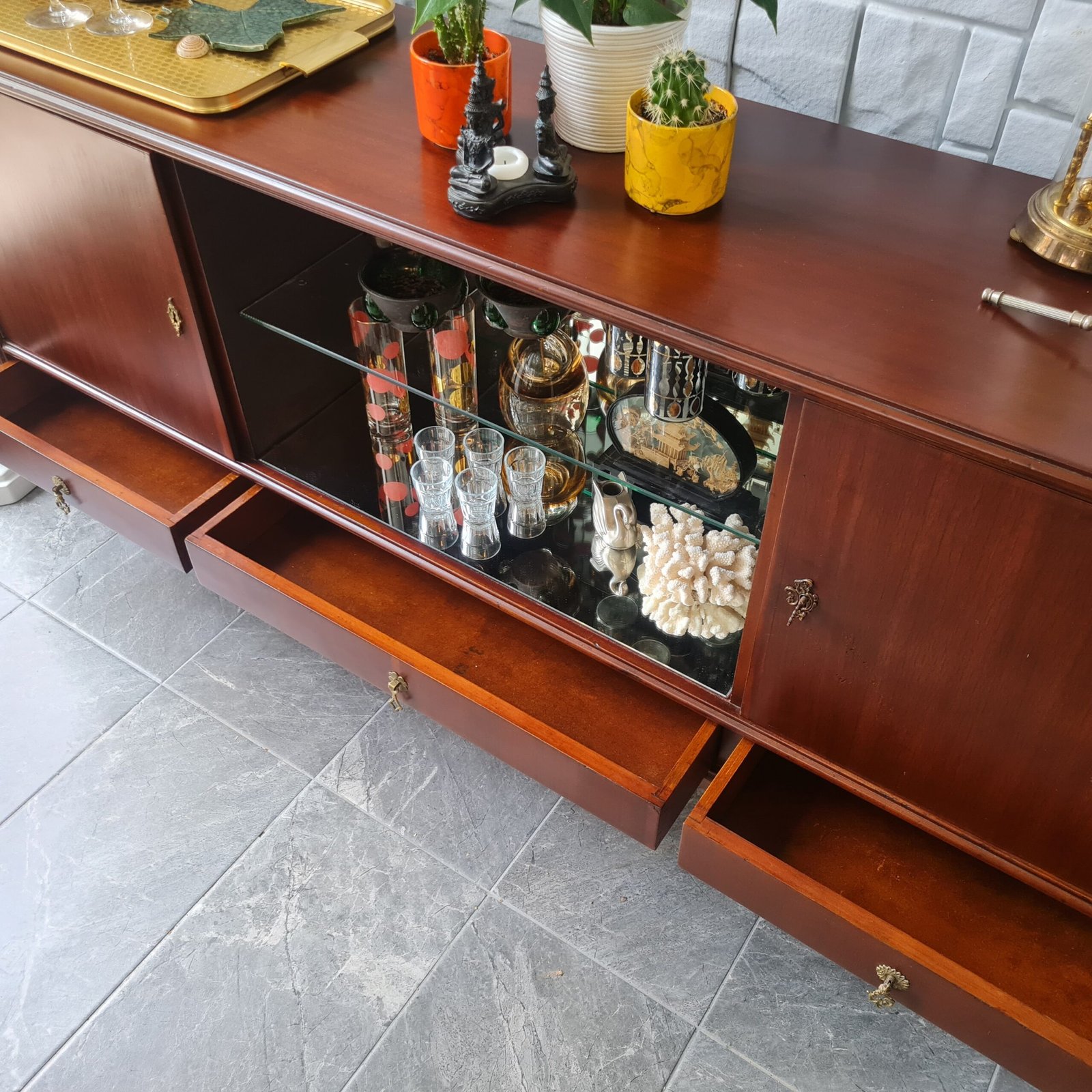 Büfenin cam raflı aynalı bölmesi, bulunduğu ortama ekstra bir ışıltı katıyor. Yıllar boyunca dayanıklılığını ve güzelliğini koruyabilmesi için, tüm bakımları yapıldı ve cilası yenilendi. Ürün stoku bir adet ile sınırlı.