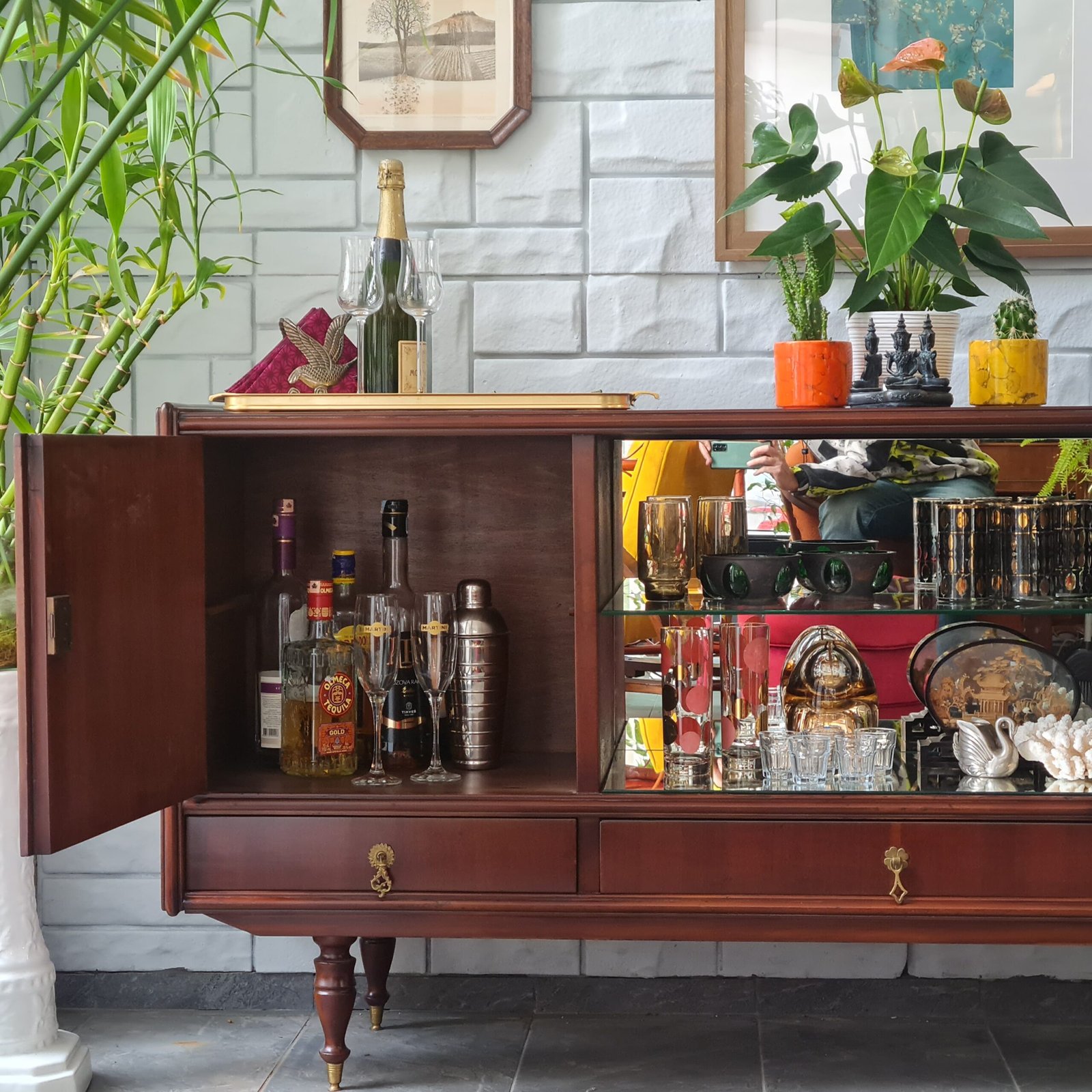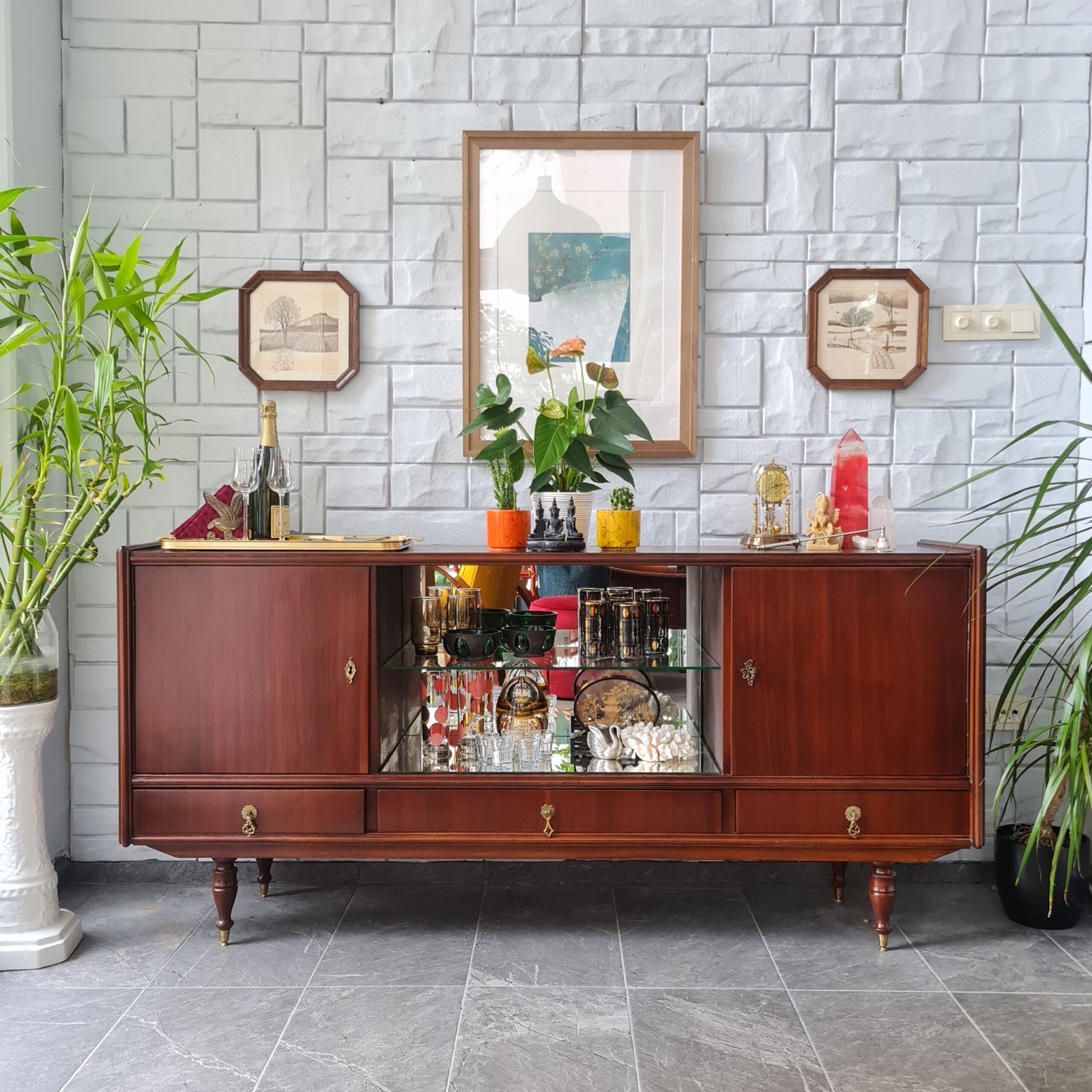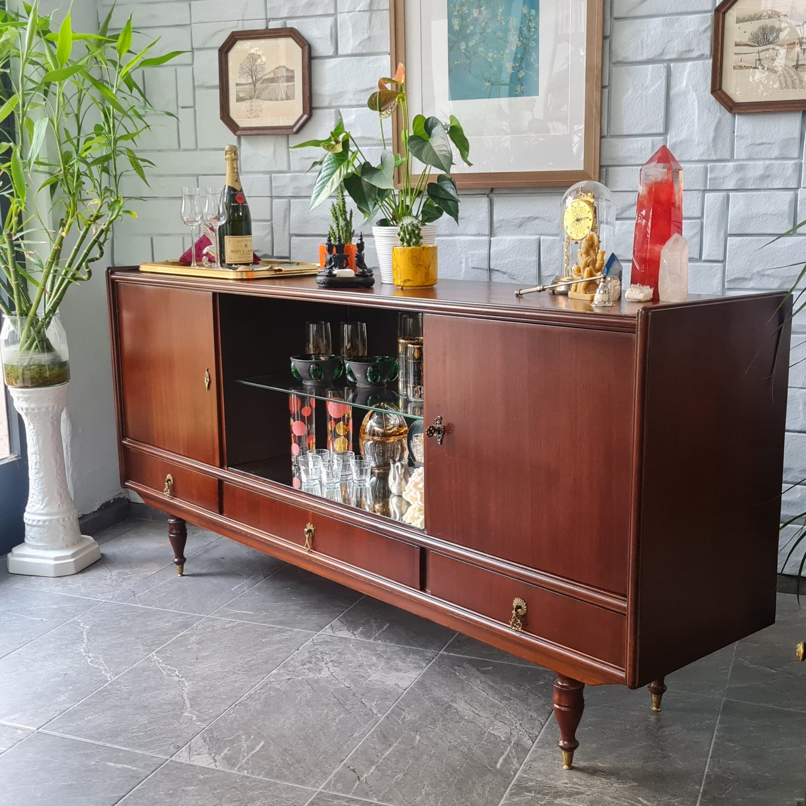 Büfenin cam raflı aynalı bölmesi, bulunduğu ortama ekstra bir ışıltı katıyor. Yıllar boyunca dayanıklılığını ve güzelliğini koruyabilmesi için, tüm bakımları yapıldı ve cilası yenilendi. Ürün stoku bir adet ile sınırlı.