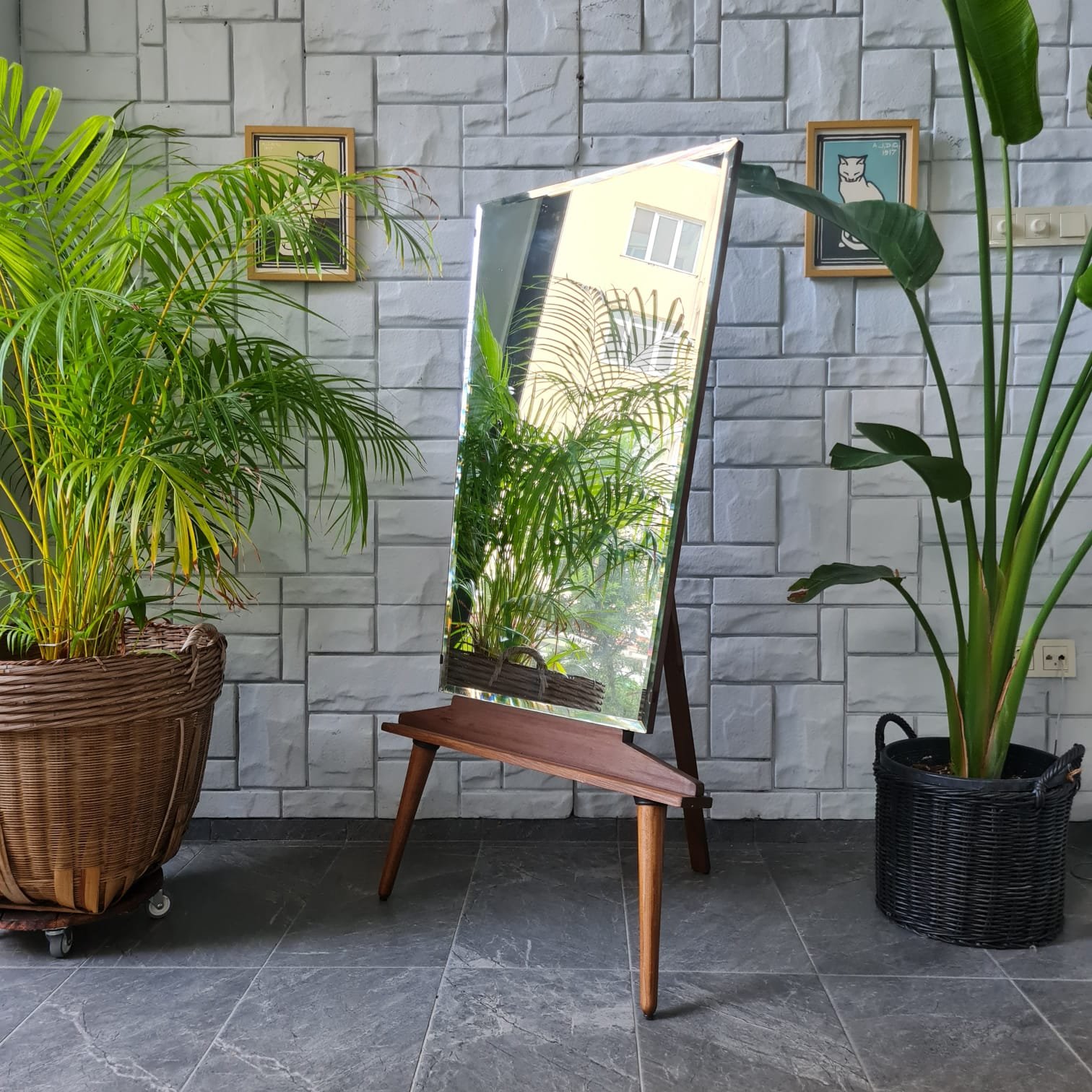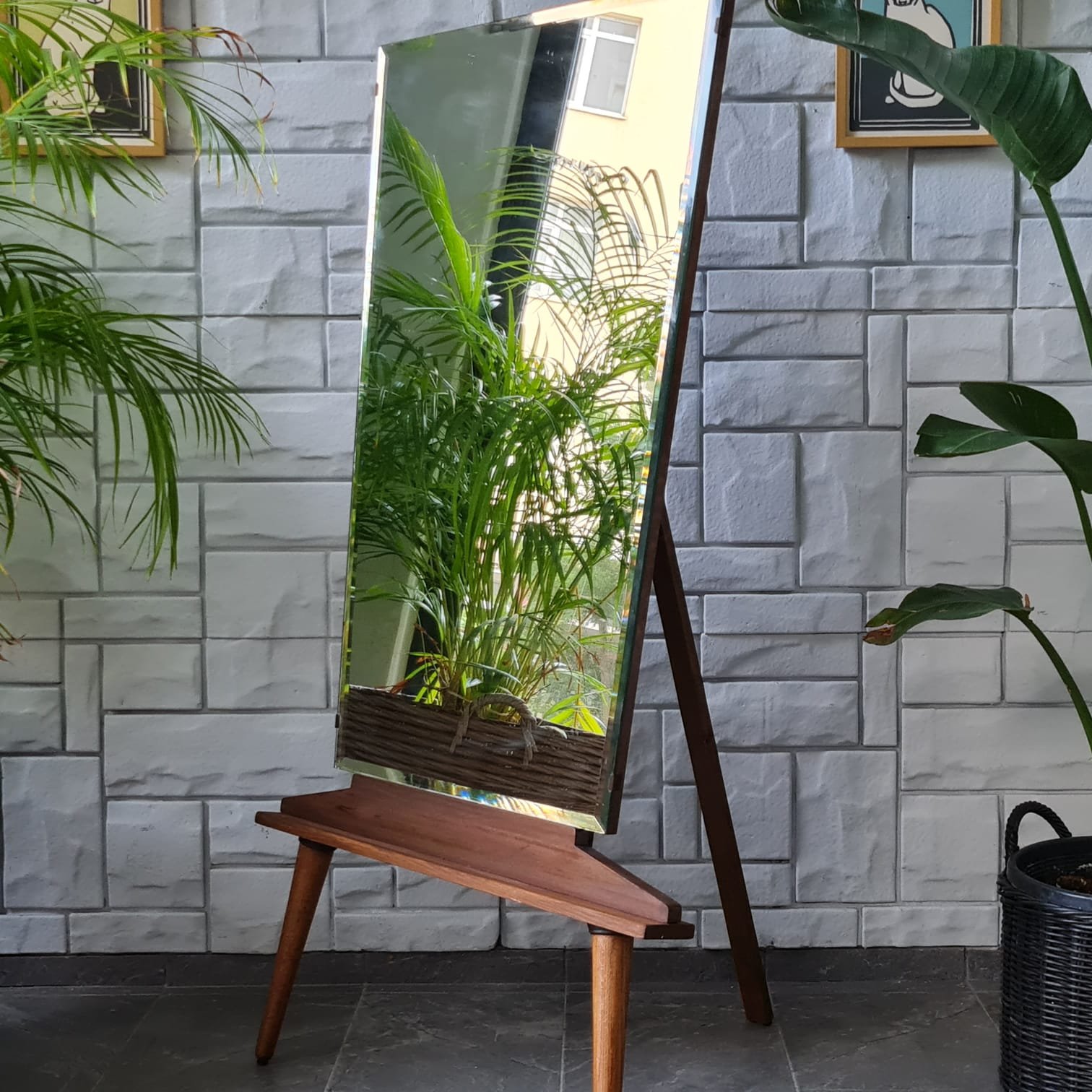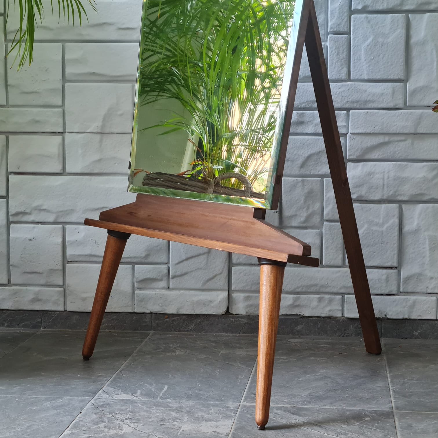 1970’lerde üretilmiş ayna. Cam yüzeyi kusursuz kondisyonda. Sonradan eklenen ayakları sayesinde boy aynası olarak kullanılabiliyor. Ayak formu, aynanın genel yapısıyla uyumlu; hem dengeli duruş hem de işlevsel kullanım sağlıyor.