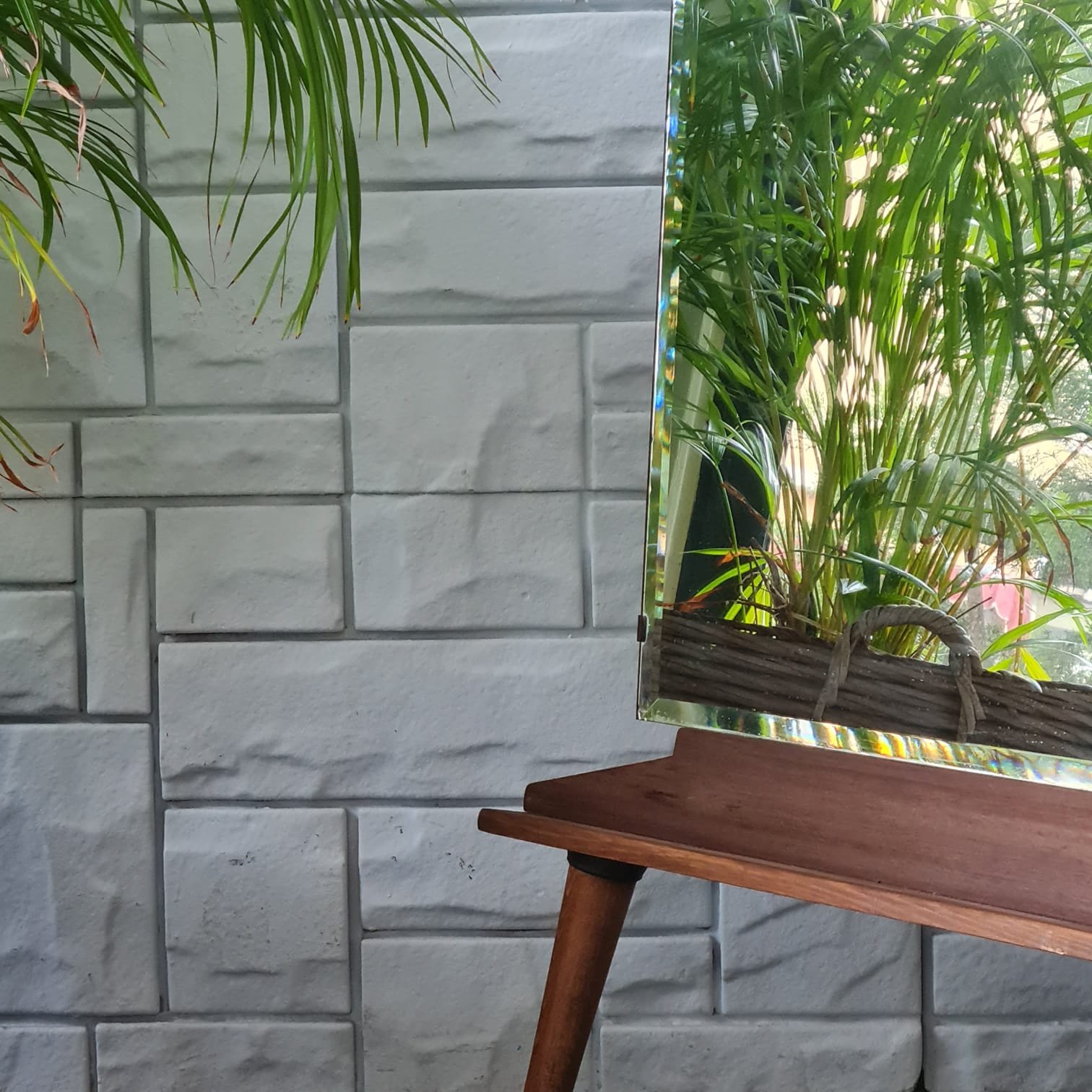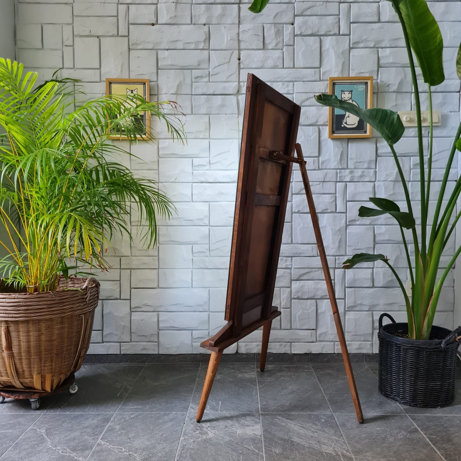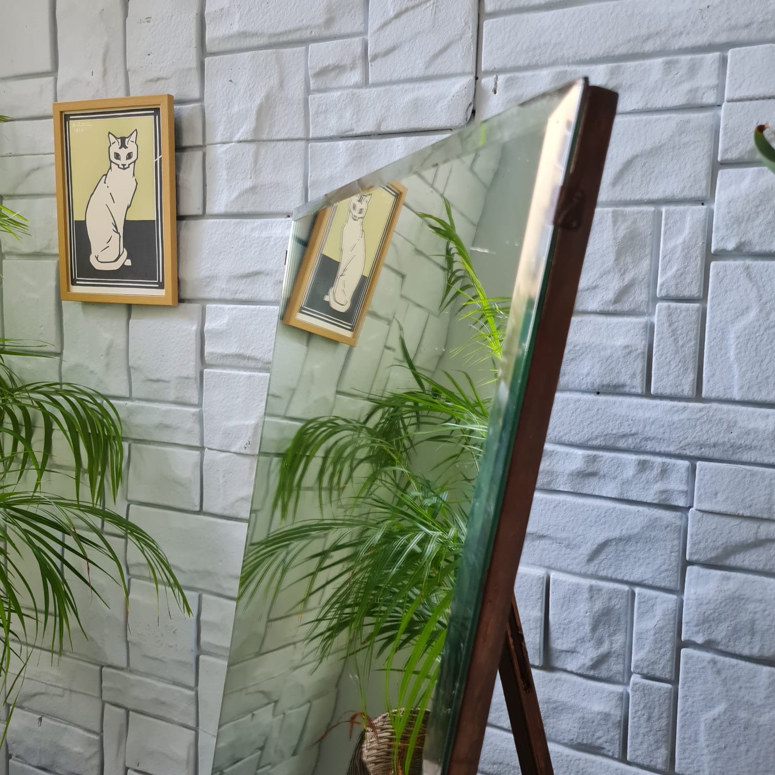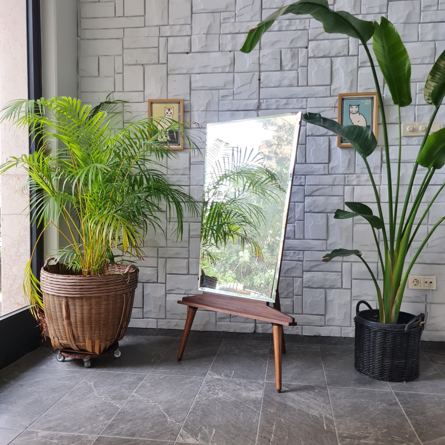 1970’lerde üretilmiş ayna. Cam yüzeyi kusursuz kondisyonda. Sonradan eklenen ayakları sayesinde boy aynası olarak kullanılabiliyor. Ayak formu, aynanın genel yapısıyla uyumlu; hem dengeli duruş hem de işlevsel kullanım sağlıyor.