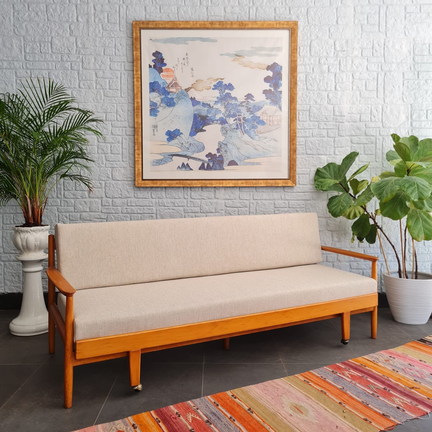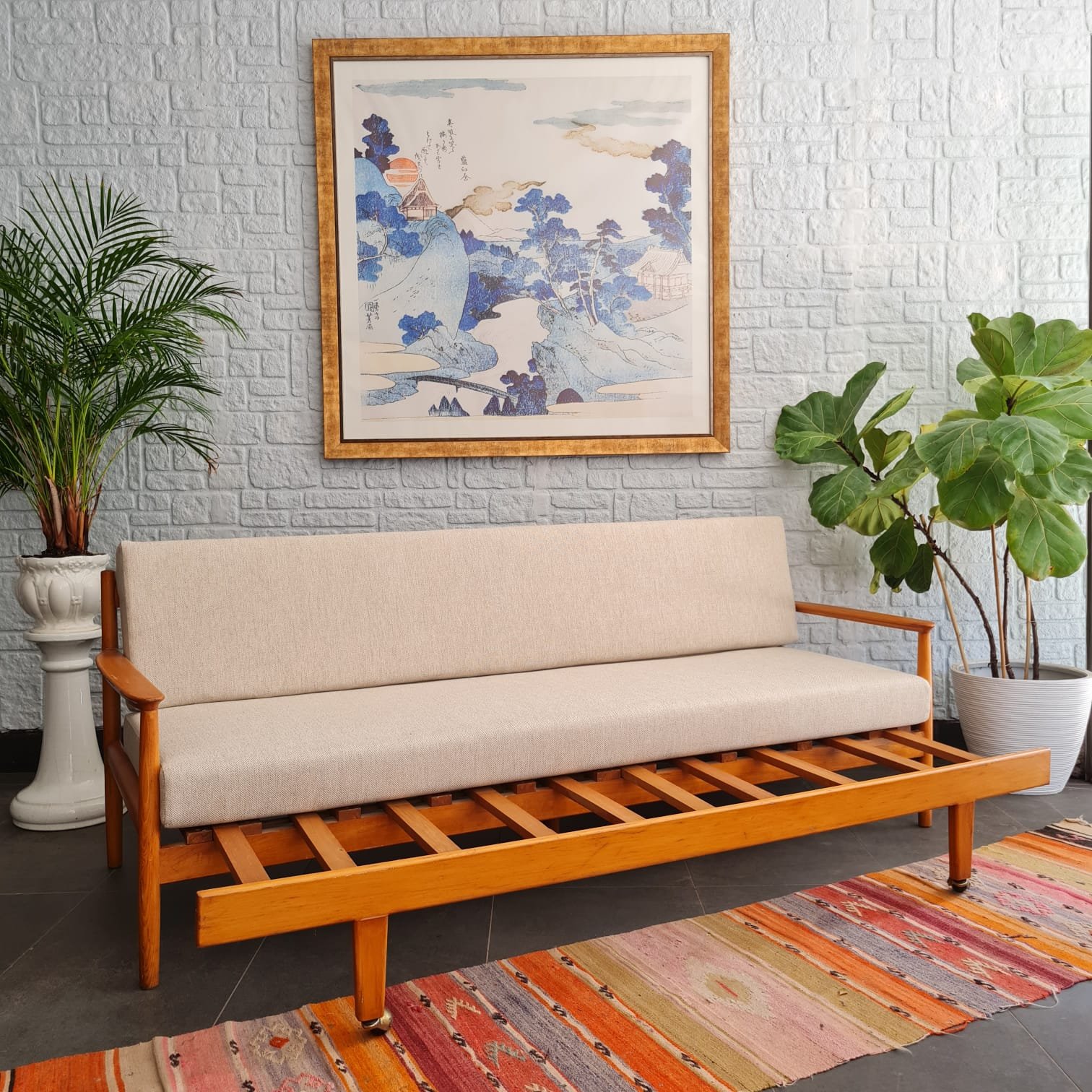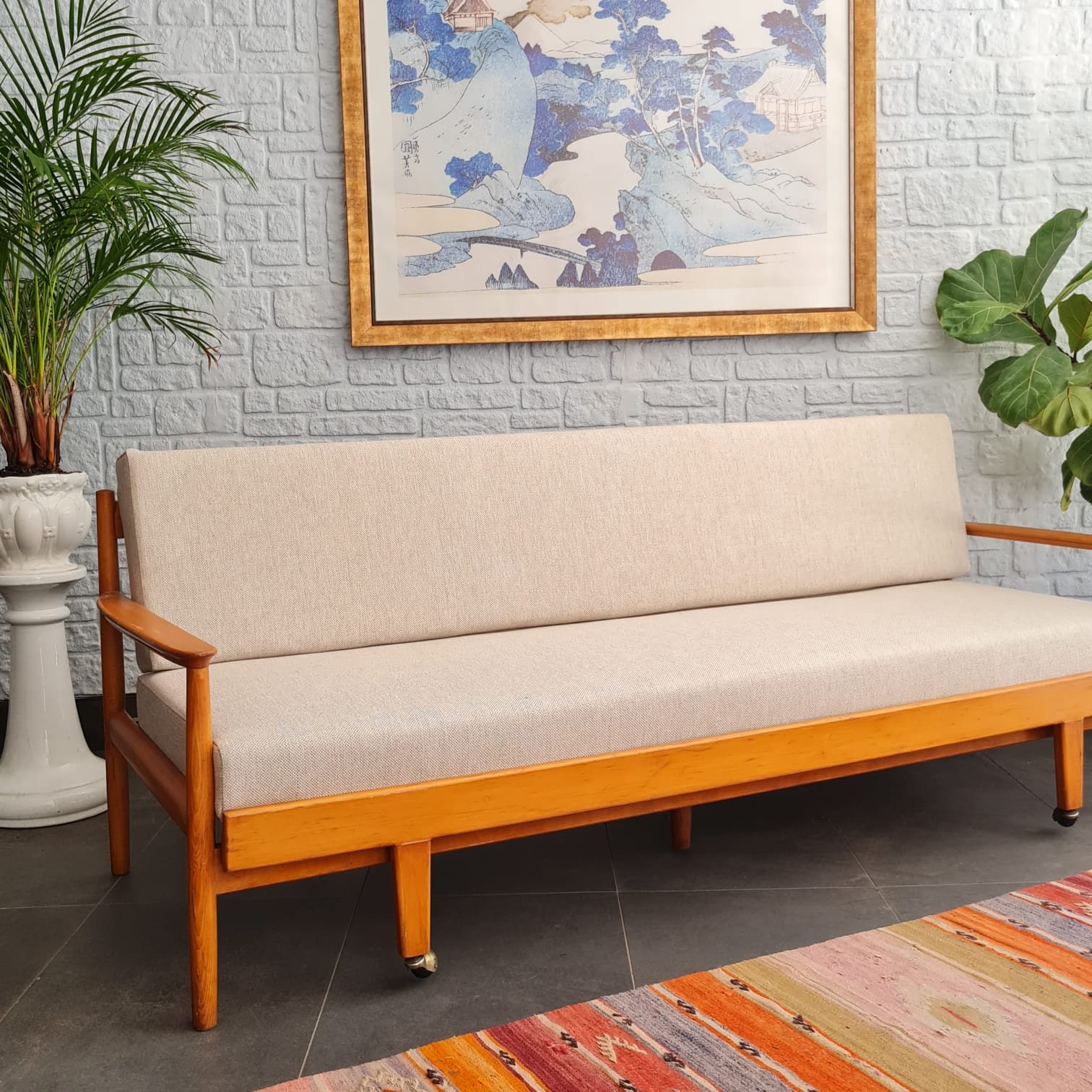 Kusursuz kondisyonda, sağlam yapısı ve zamansız formuyla hem fonksiyonel hem estetik bir parça. Hem oturma alanı hem de gerektiğinde yatak olarak kullanılabilecek çok yönlü tasarımıyla İskandinav stilinin yalın çizgilerini yansıtıyor.