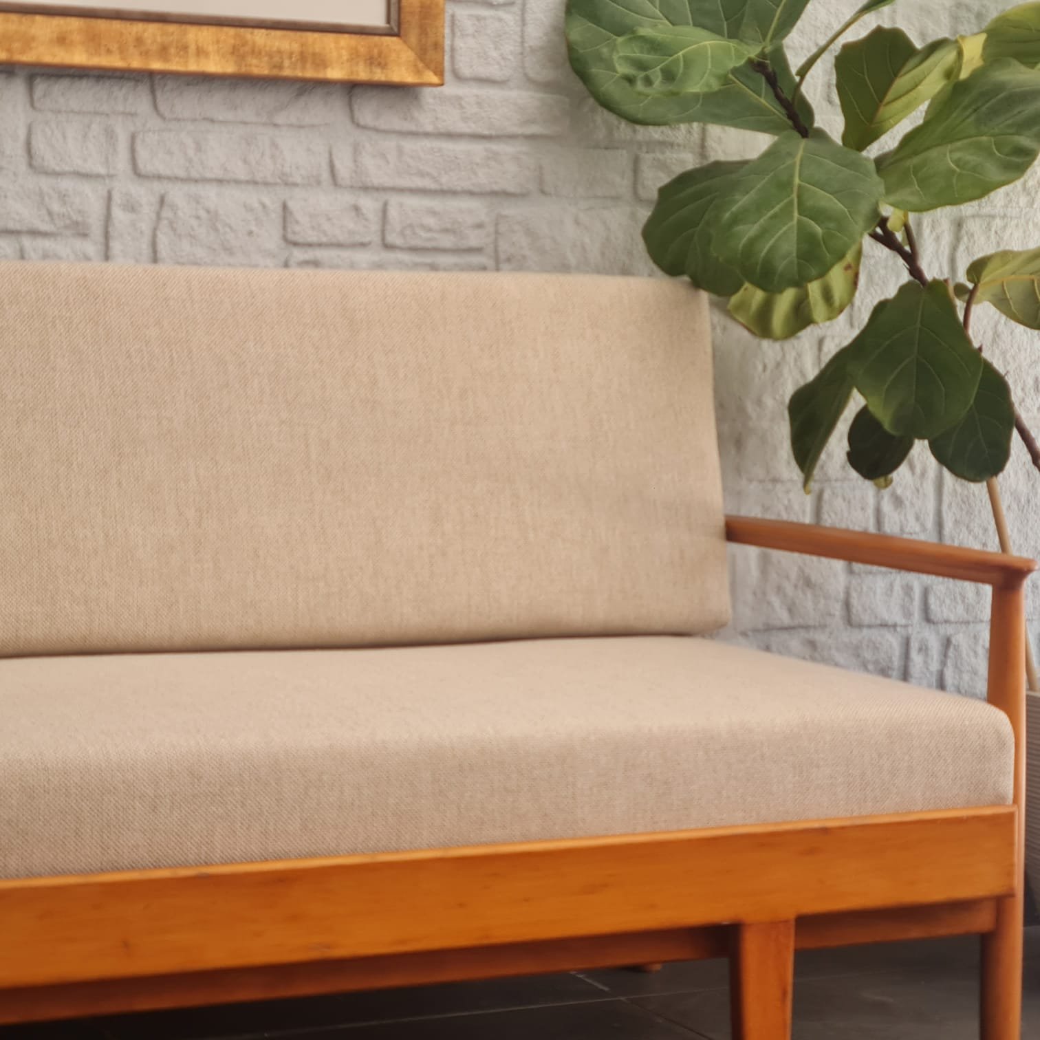 1970’lerde üretilmiş, masif meşe iskeletli açılır-kapanır kanepe. Döşemesi keten kumaşla yenilendi, süngerleri değiştirildi ve cilası tazelendi.