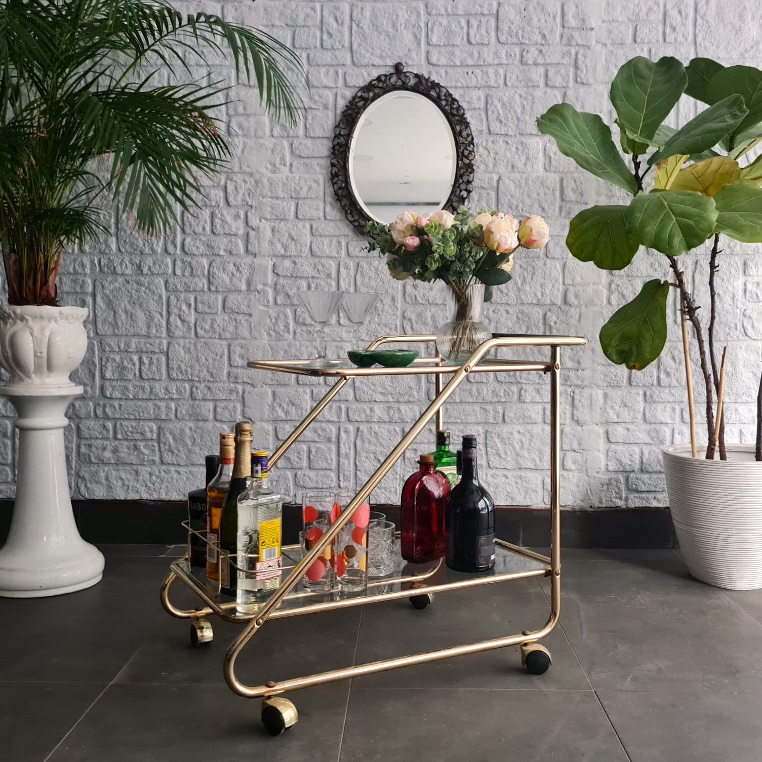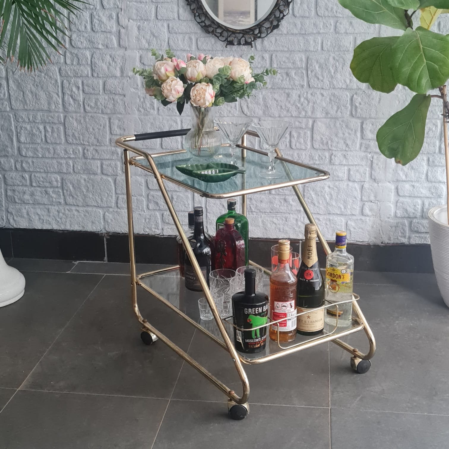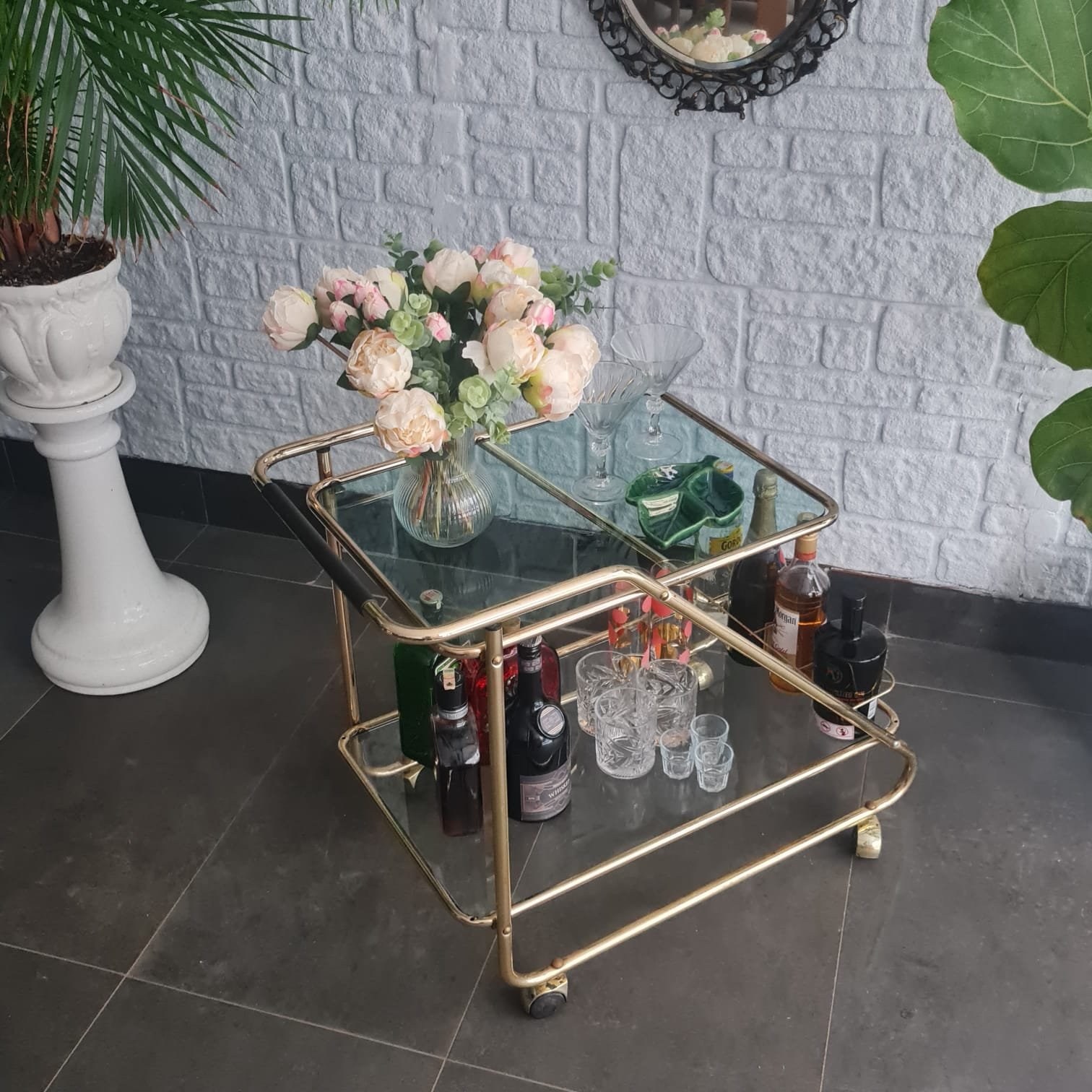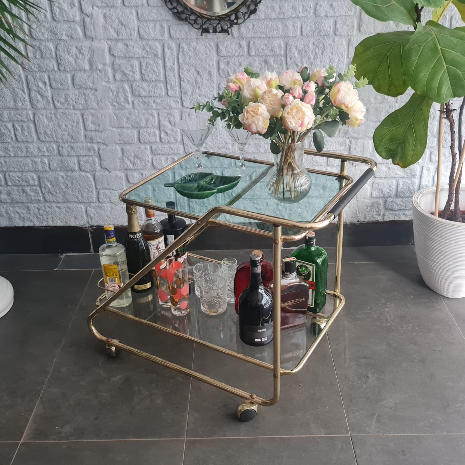 İki katlı cam raflı yapı. Tekerlekli formu sayesinde servis arabası, bar arabası ya da yardımcı sehpa olarak kullanılabilir. Mid-century dönemin sade ve dengeli çizgilerini taşıyor.