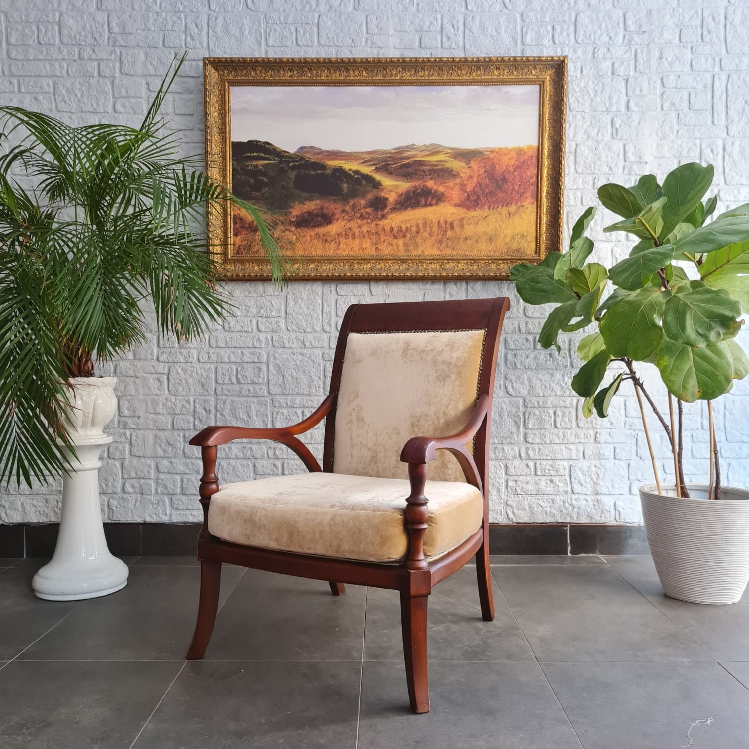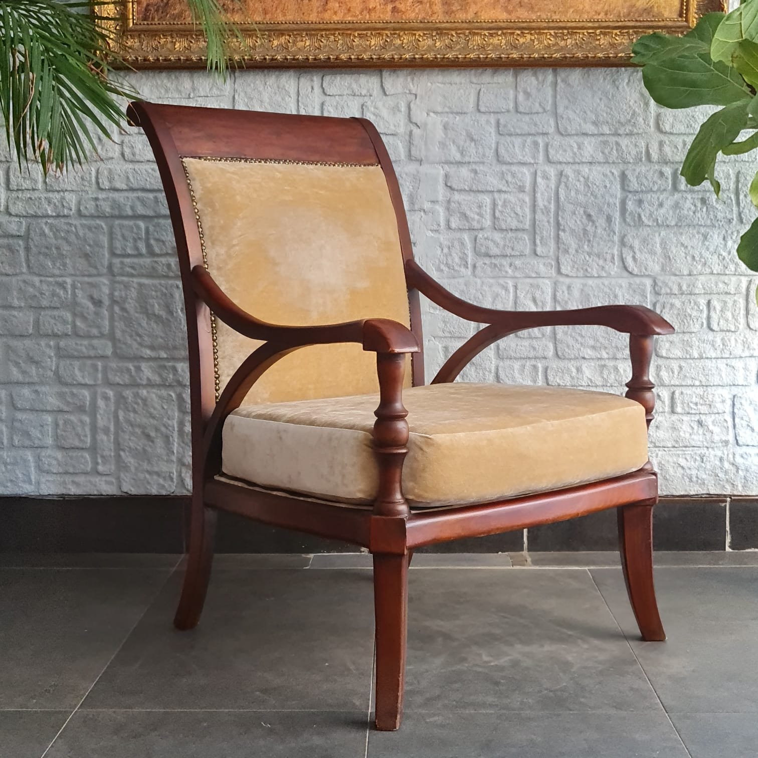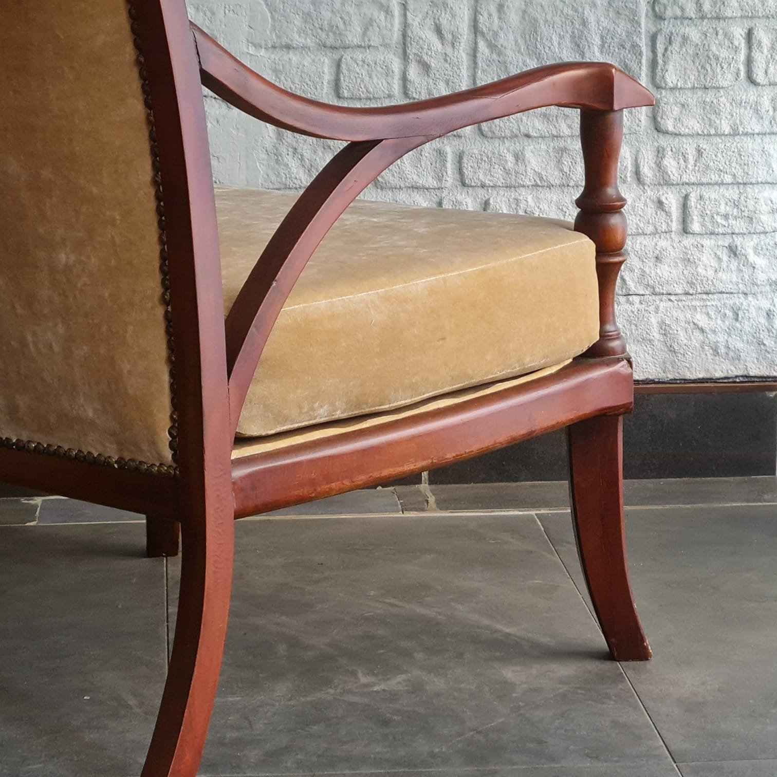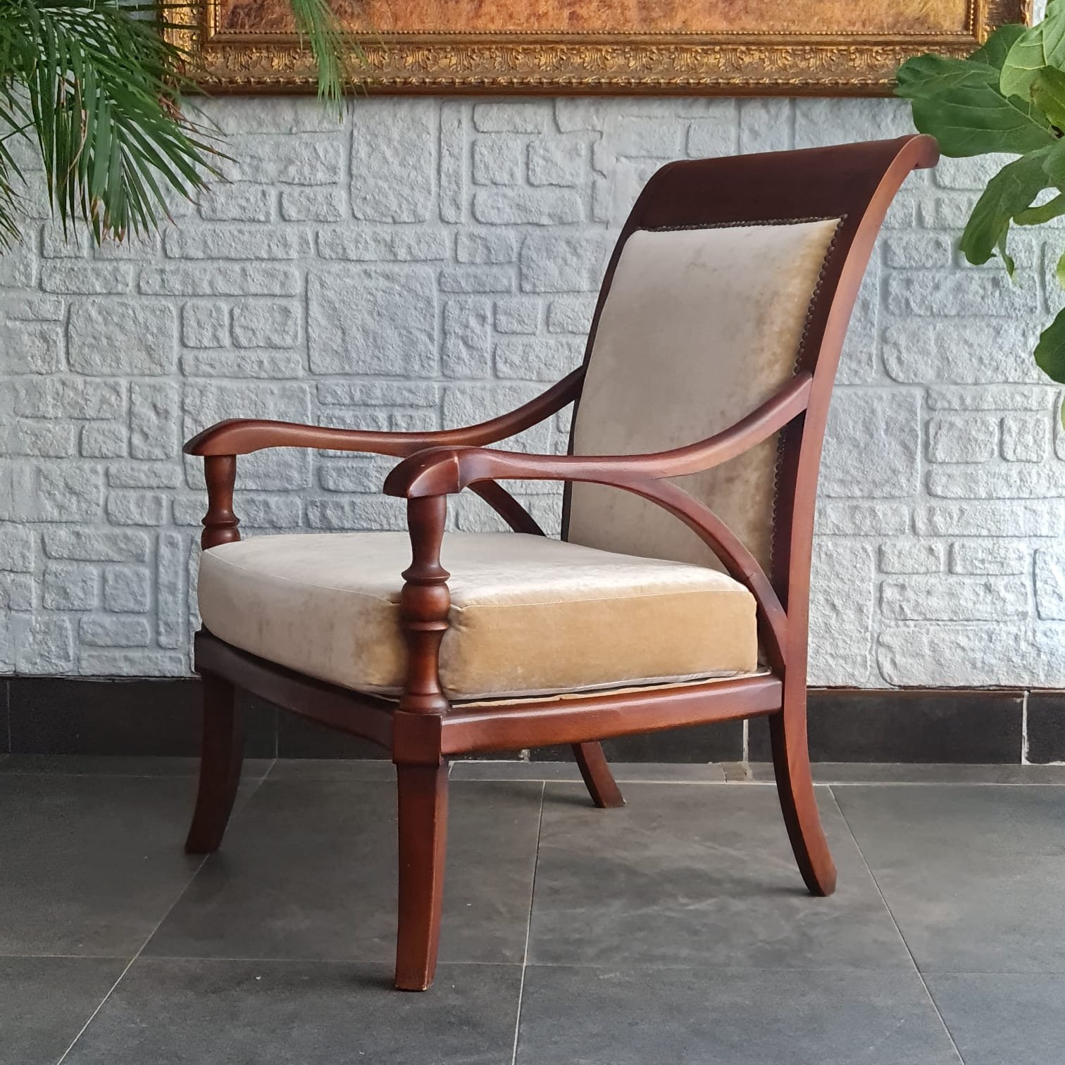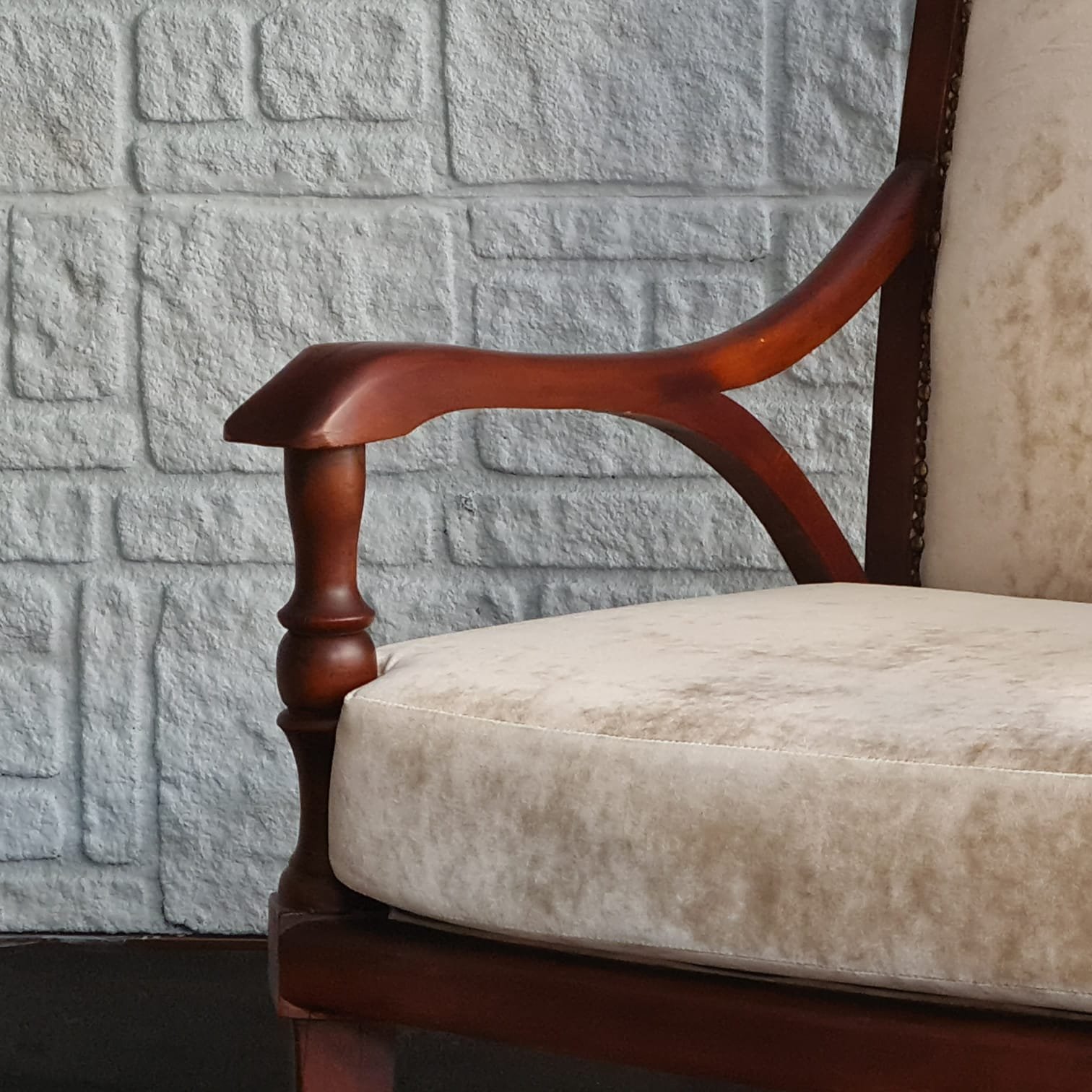 1980’lerde üretilmiş berjer. Ahşap gövdesinin cilası yenilendi. Döşemesi yüksek kalite kadife kumaşla yenilendi. Oturum yapısı rahat ve dengeli. Günlük kullanıma uygun olduğu gibi salon, okuma köşesi ya da yatak odalarında tekli koltuk olarak rahatlıkla değerlendirilebilir. Kondisyonu son derece yüksek