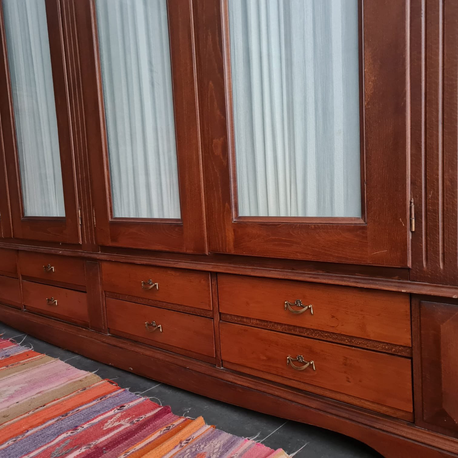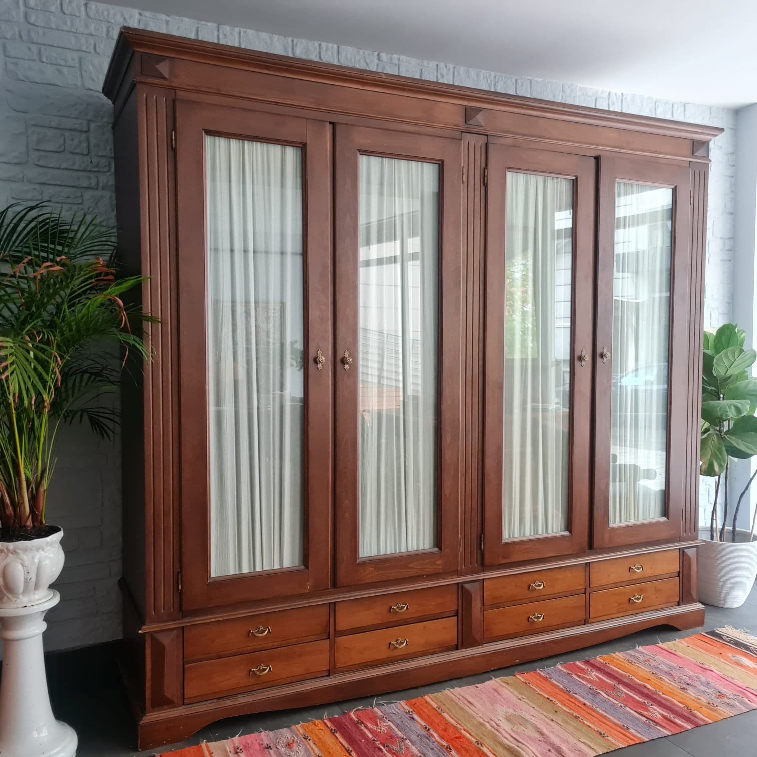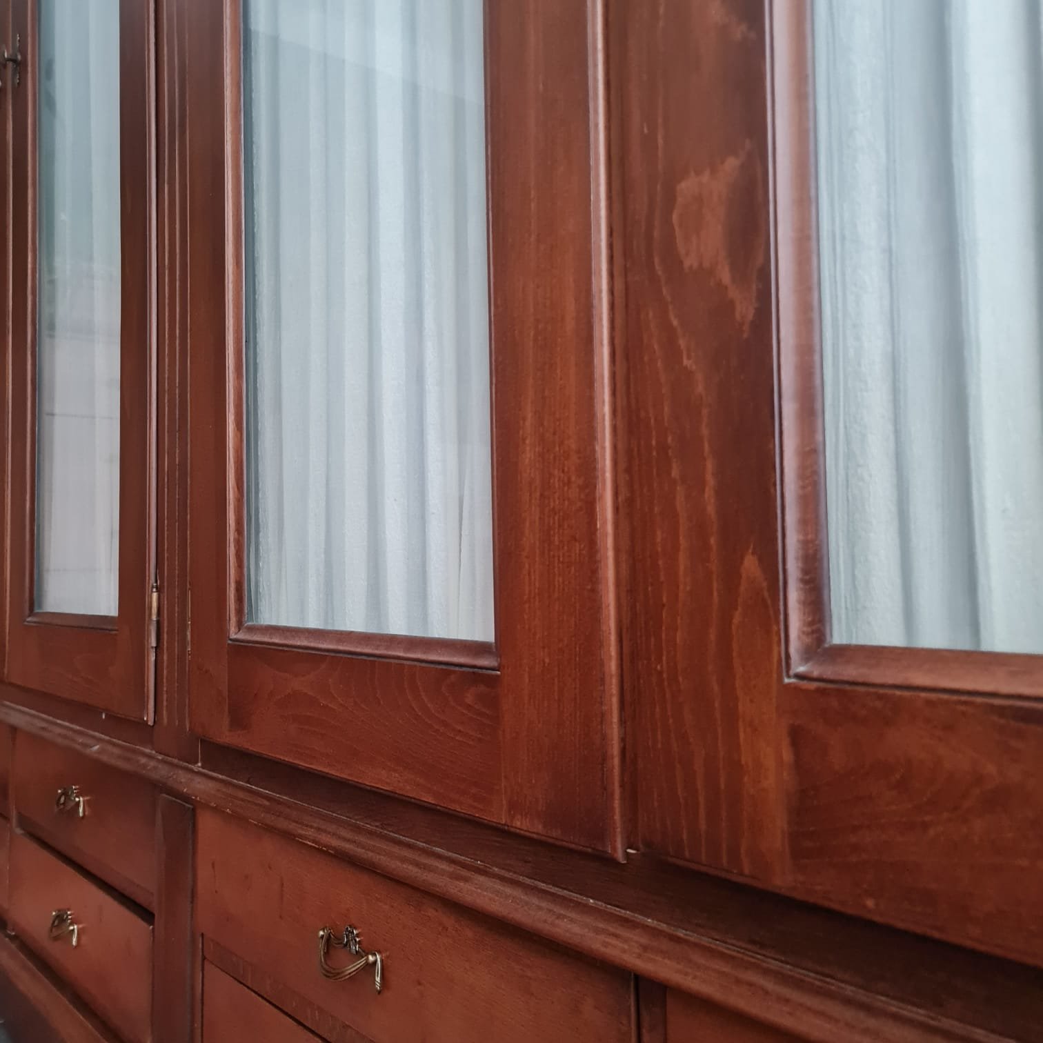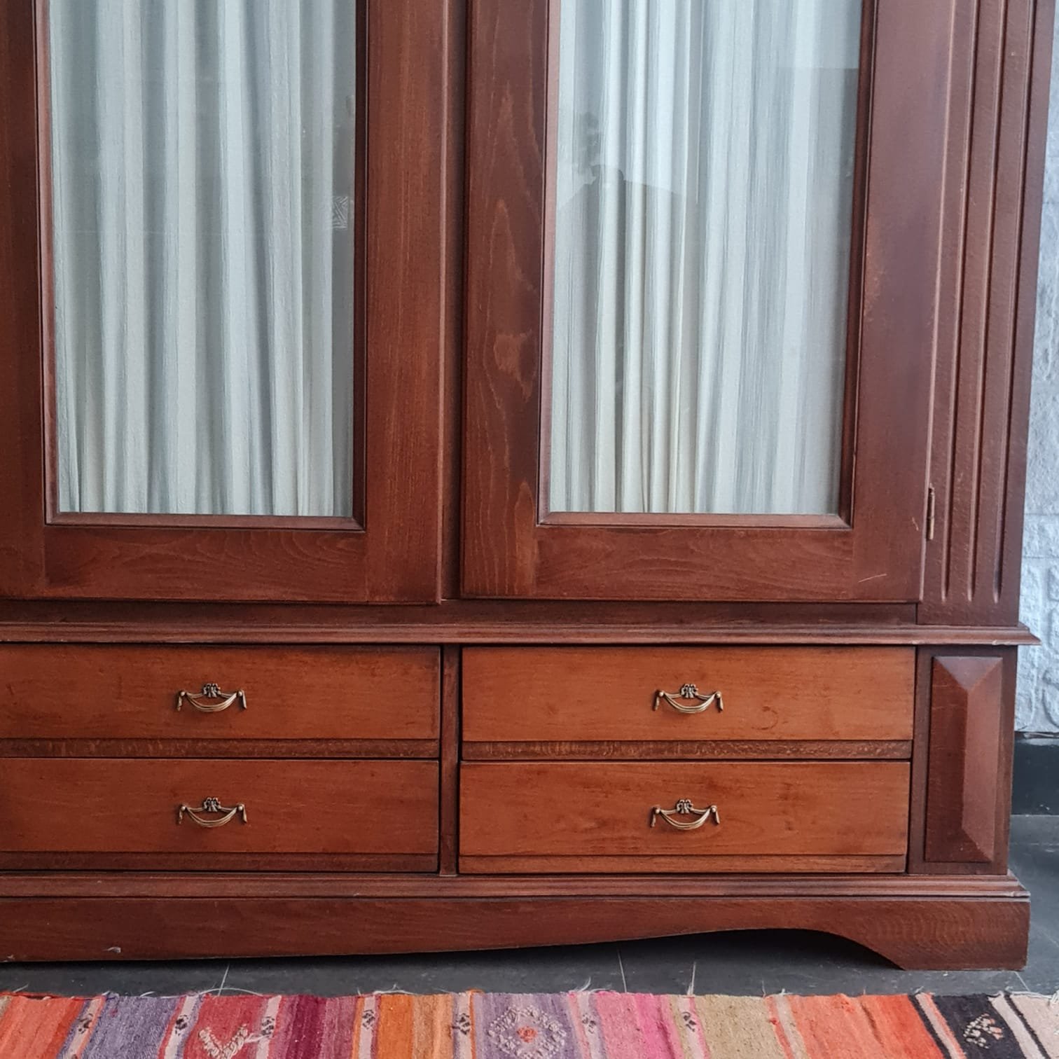 Kulpları yenilenmiş, perdeleri ise kusursuz durumda. Gardırop geniş depolama hacmine ve büyük ebatlarına rağmen, krem rengi perdeleri ve camlı kapaklarıyla, bulunduğu odaya farklı bir hava ve ferahlık katacak, evinize zarif bir dokunuş getirecek.