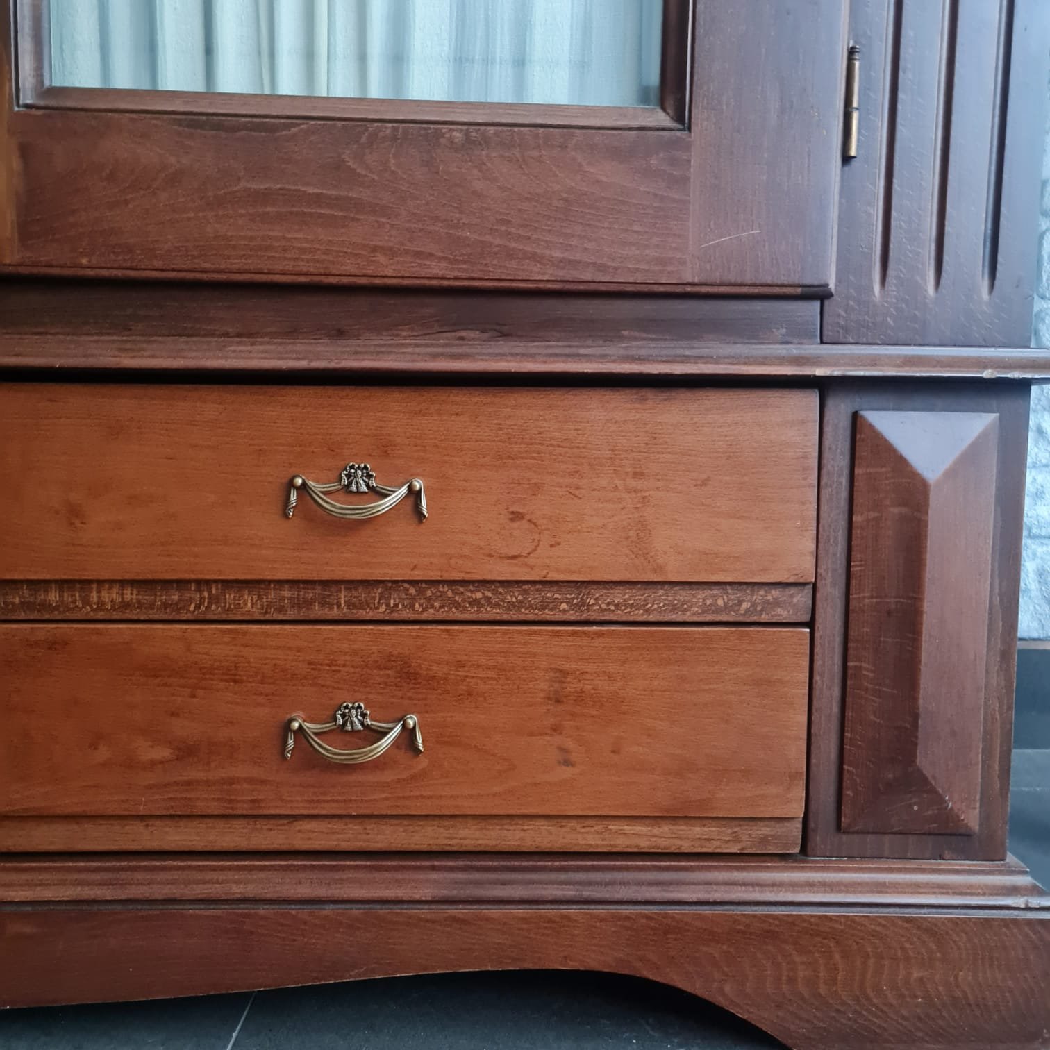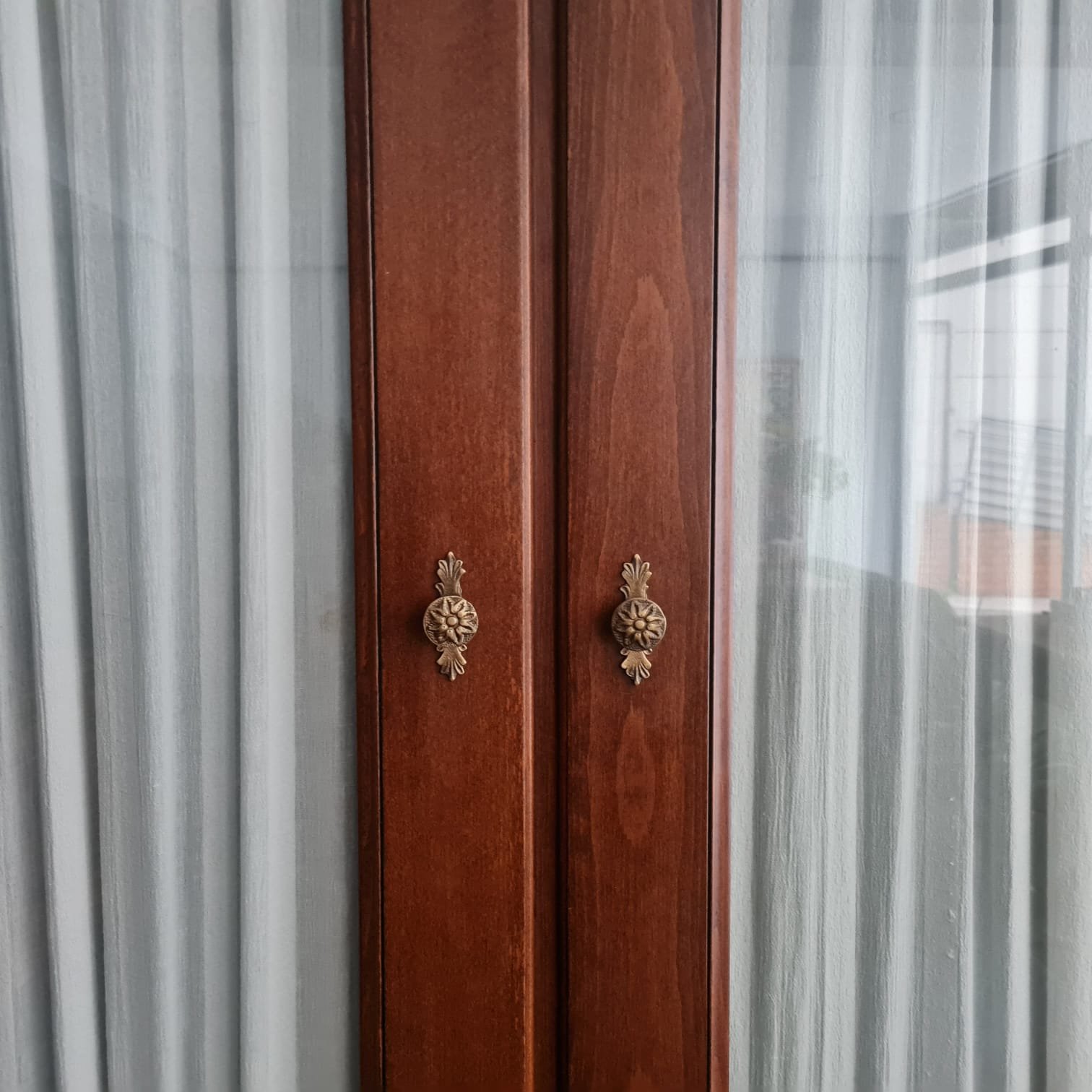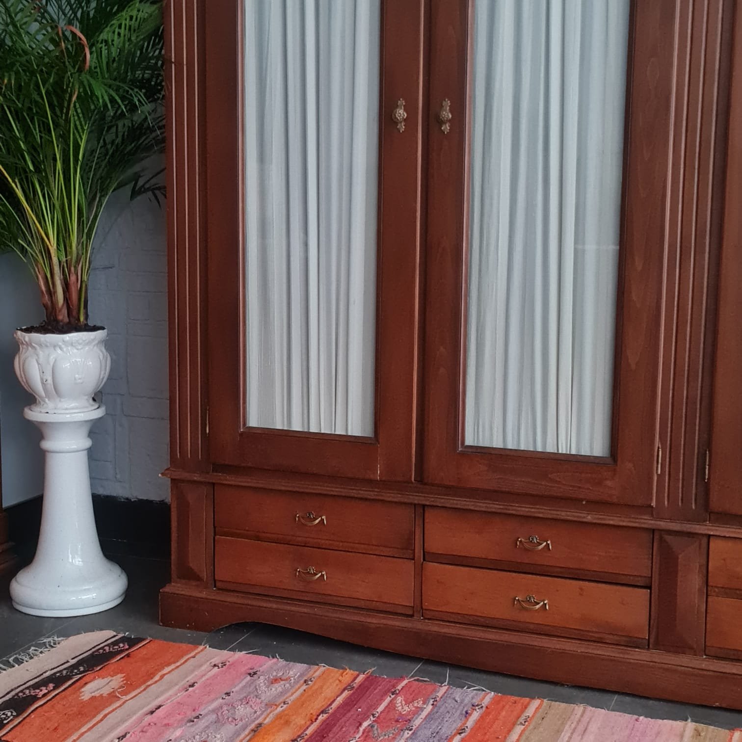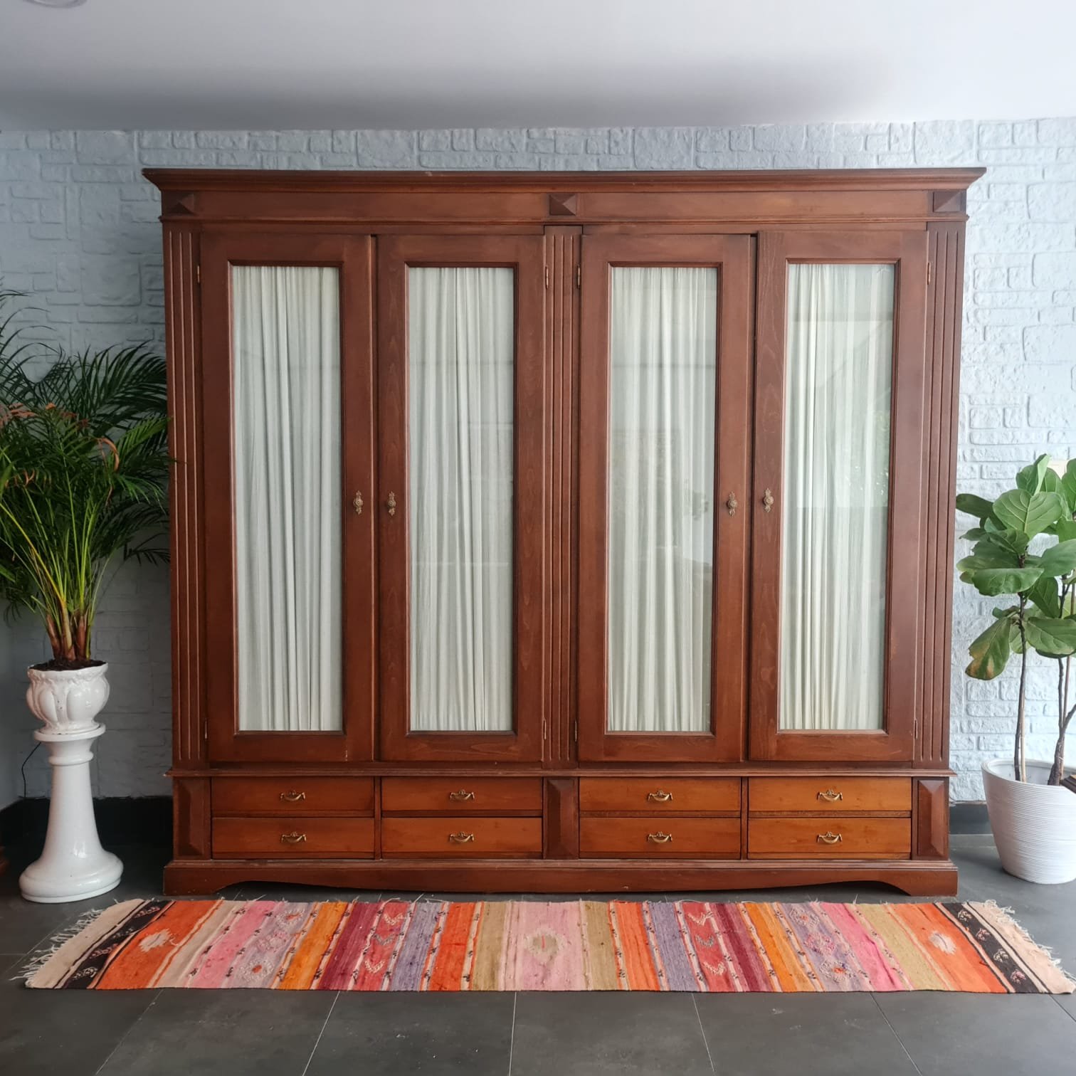 Kulpları yenilenmiş, perdeleri ise kusursuz durumda. Gardırop geniş depolama hacmine ve büyük ebatlarına rağmen, krem rengi perdeleri ve camlı kapaklarıyla, bulunduğu odaya farklı bir hava ve ferahlık katacak, evinize zarif bir dokunuş getirecek.