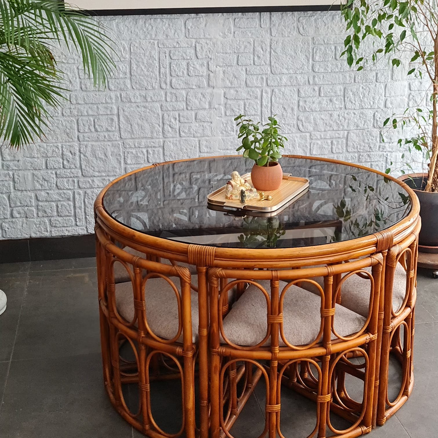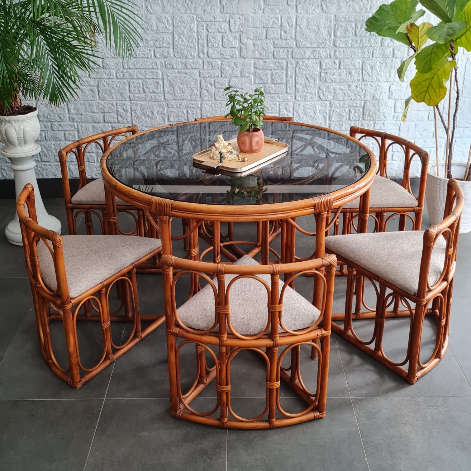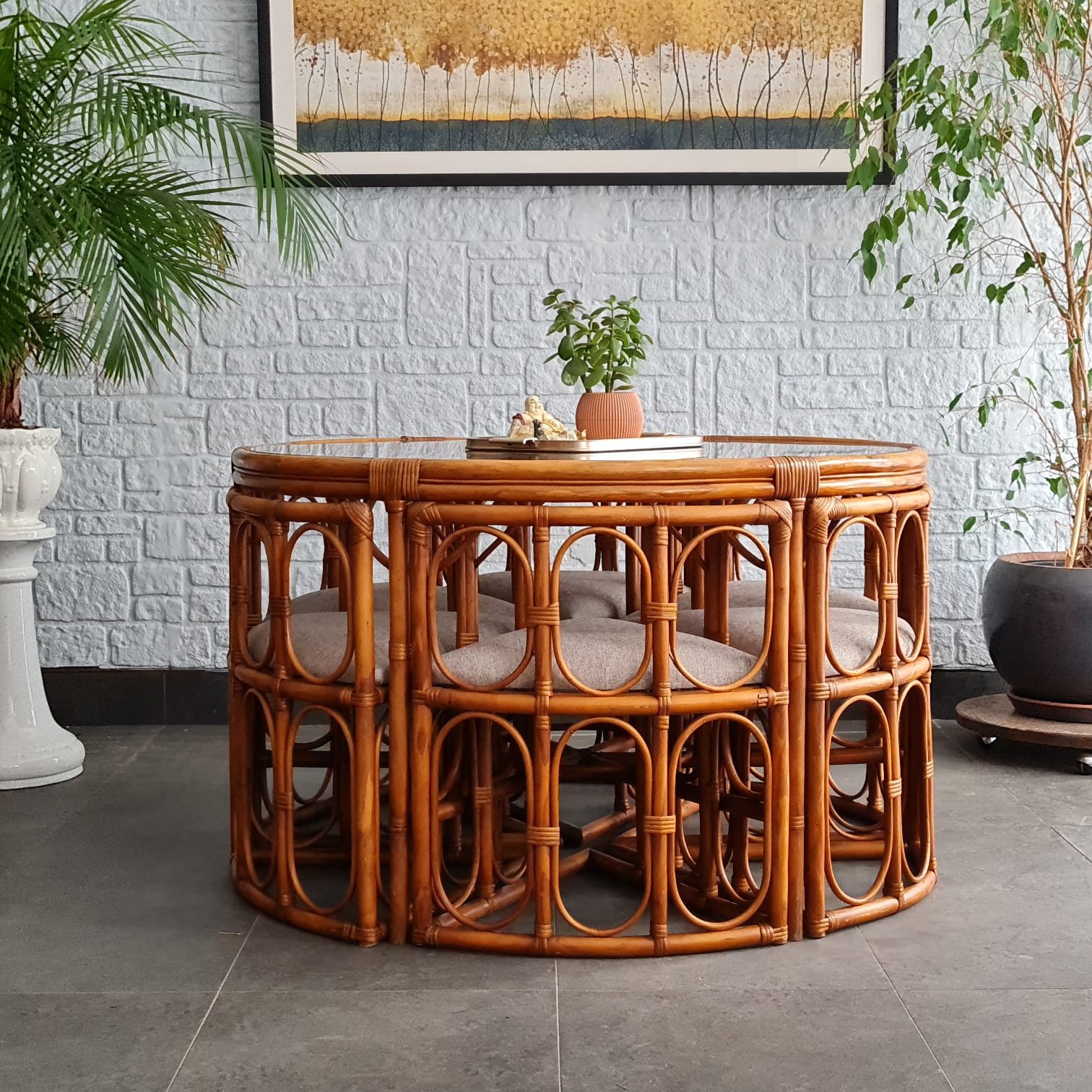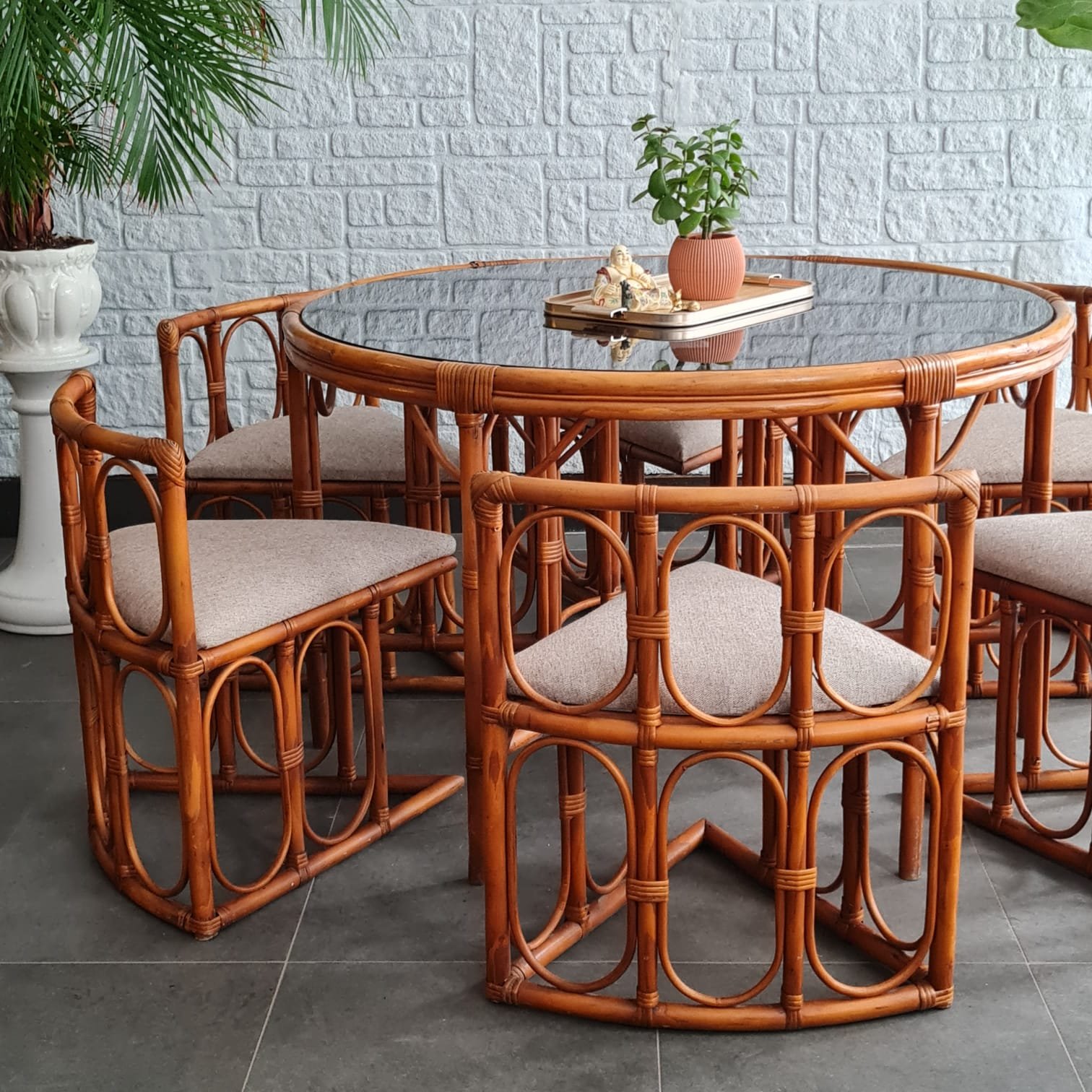 1970’ler Avrupa üretimi circular nesting rattan yemek masası takımı.