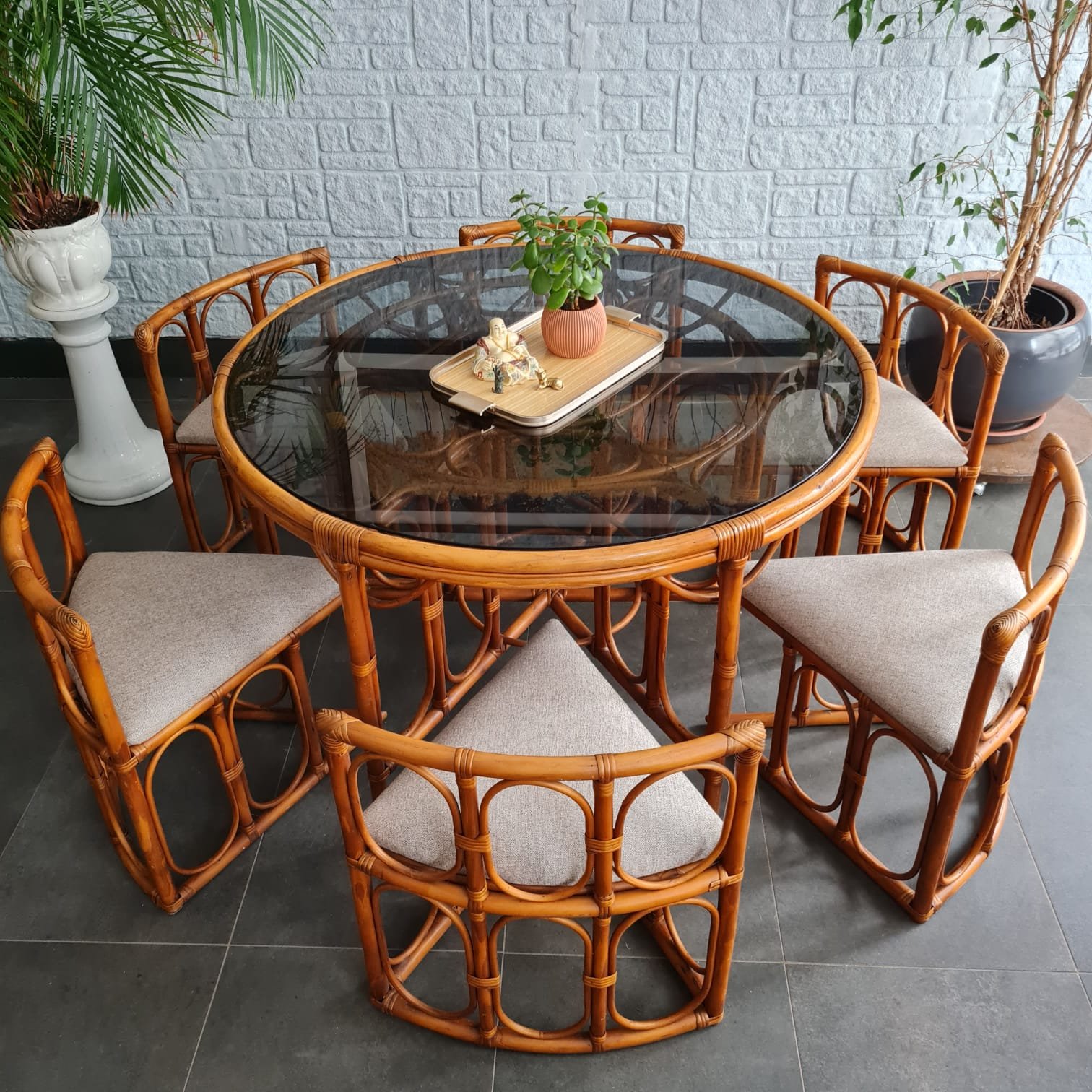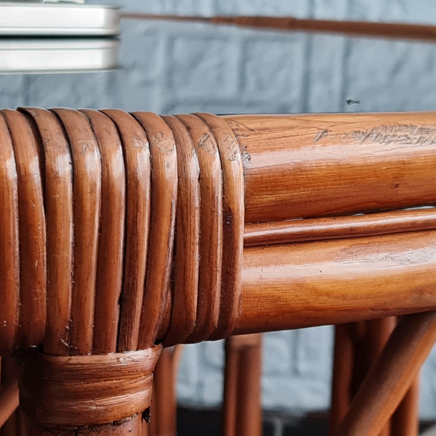 Vida kullanılmadan geleneksel rattan sarım tekniğiyle üretilmiş. Füme cam tablası orijinal.