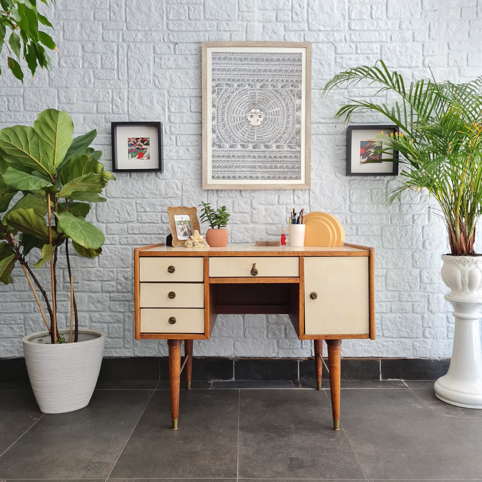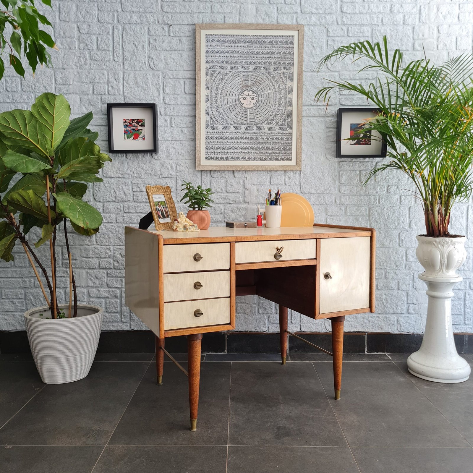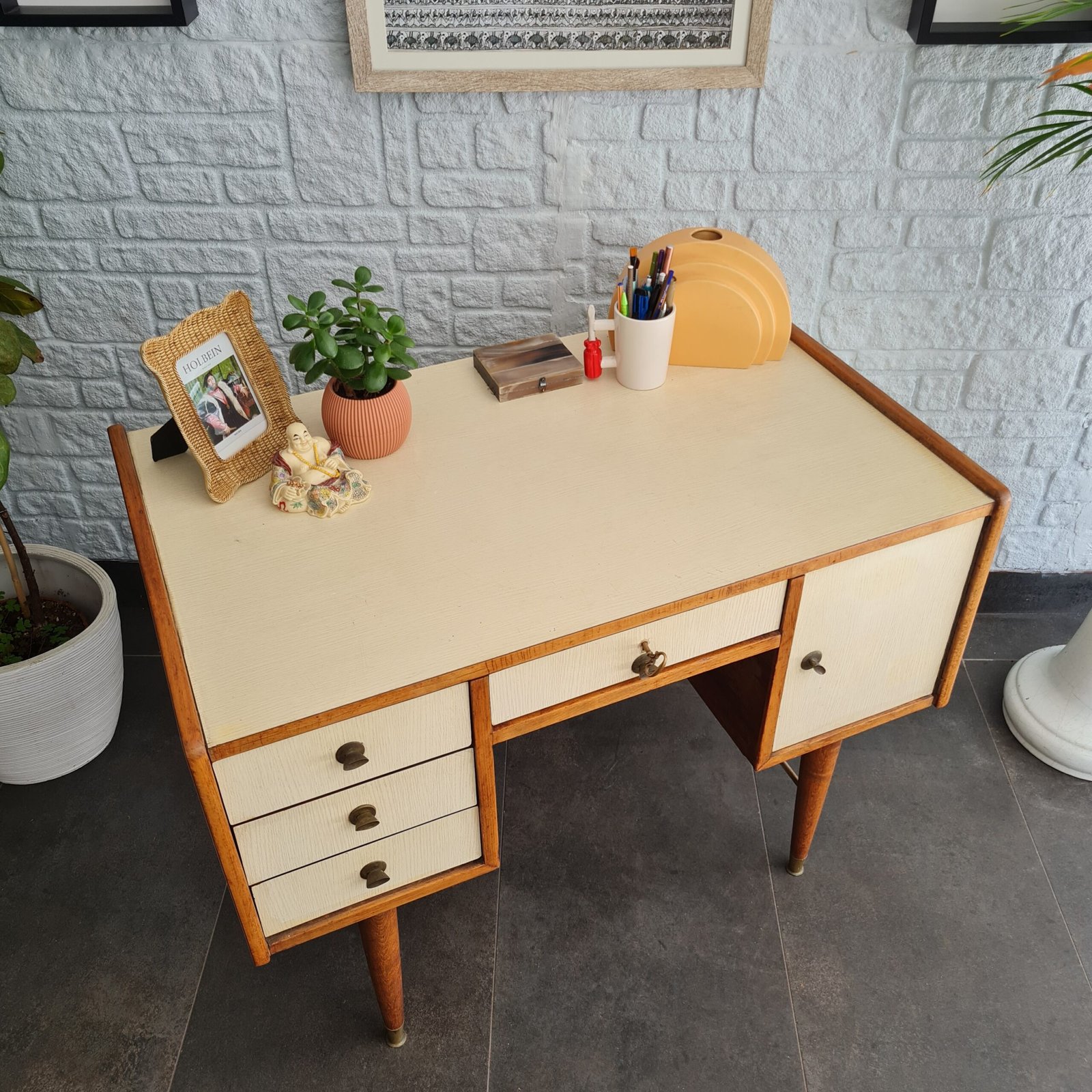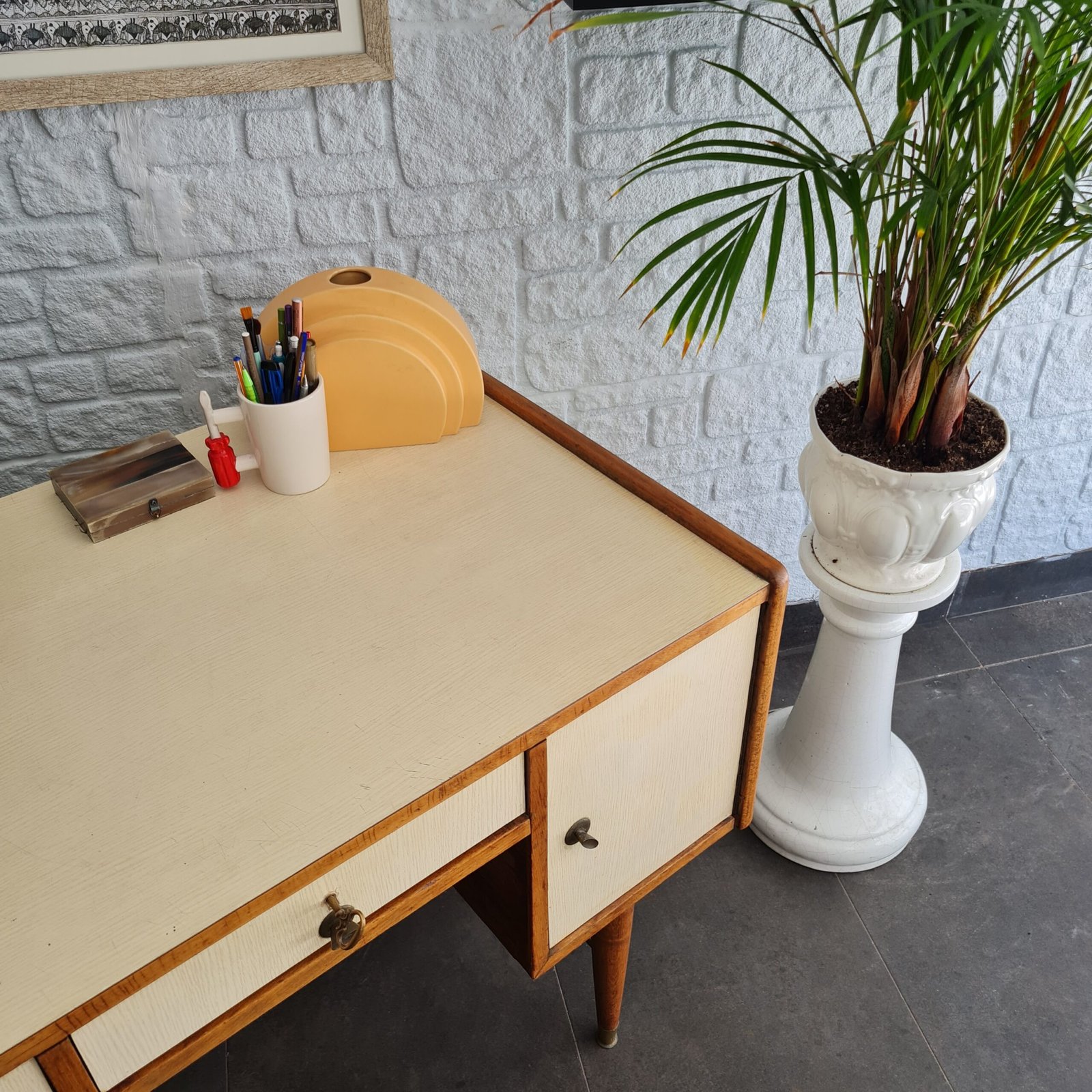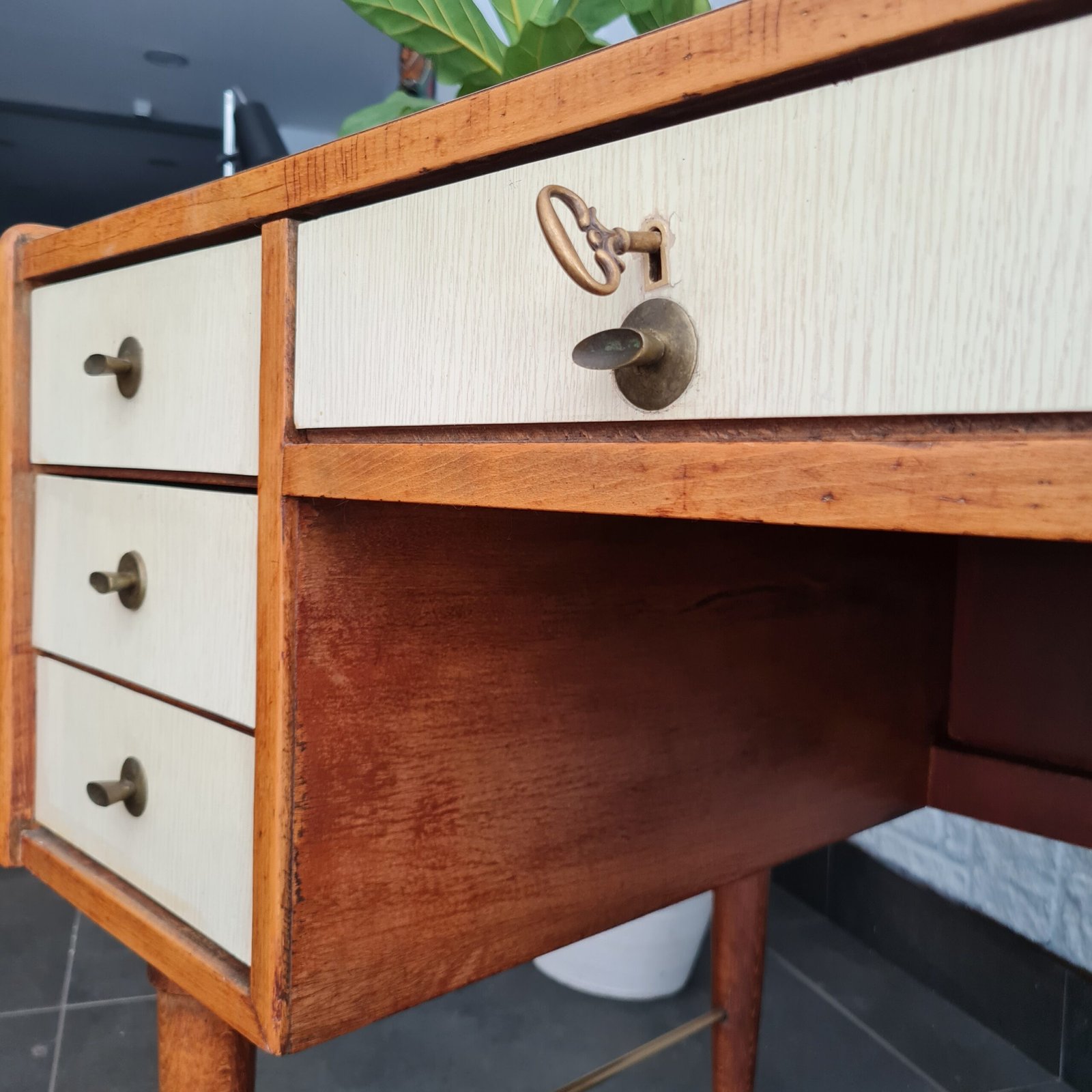 Formika çalışma masası, 1970’lerde üretilmiş ve zamanının popüler tasarım anlayışını yansıtan bir parça. Masanın masif meşe iskeleti, onun sağlamlığı ve dayanıklılığını garanti ediyor.
