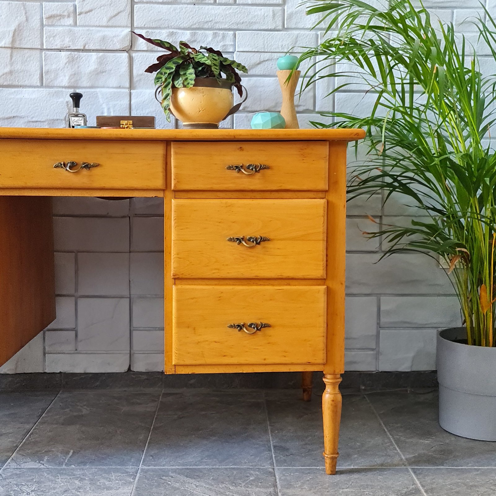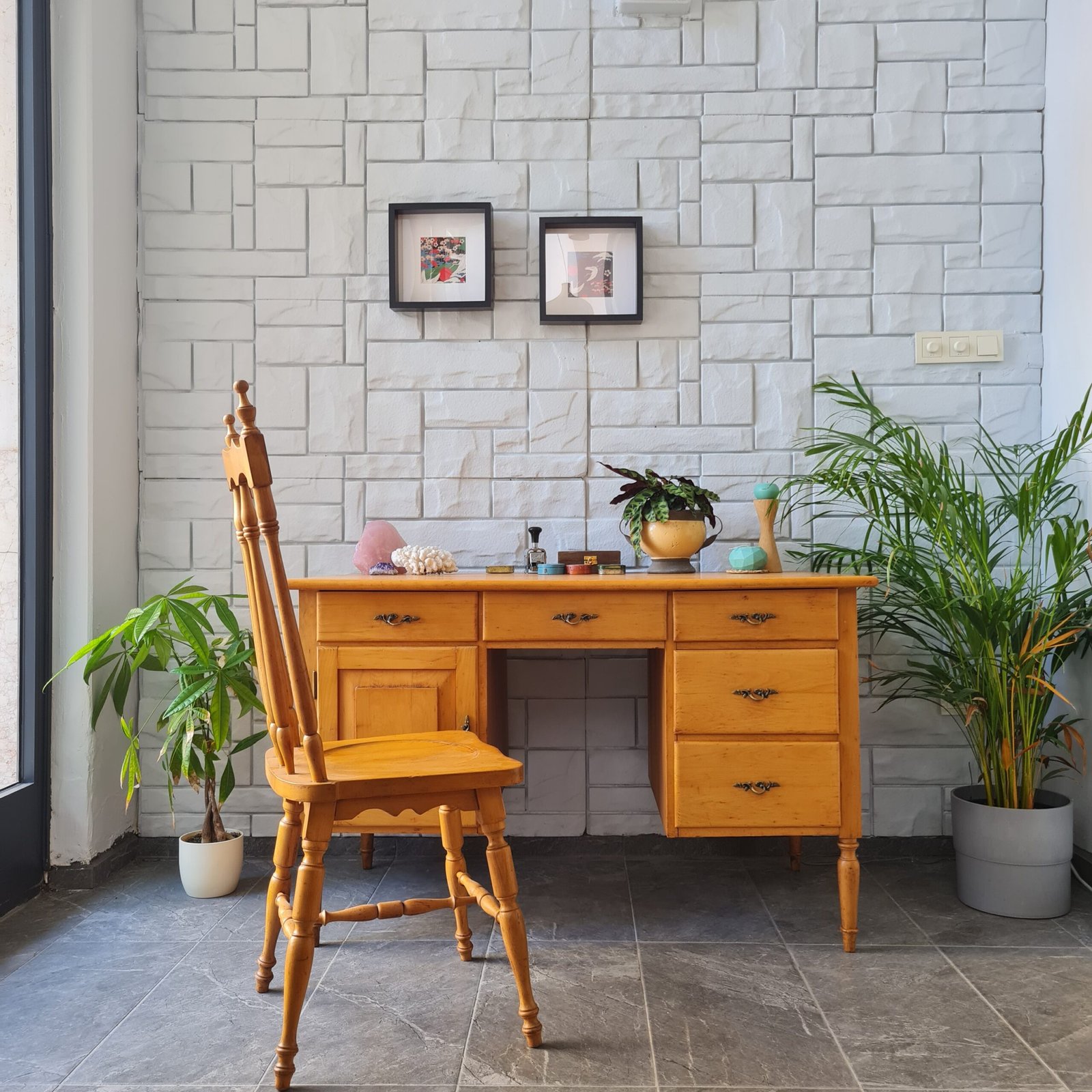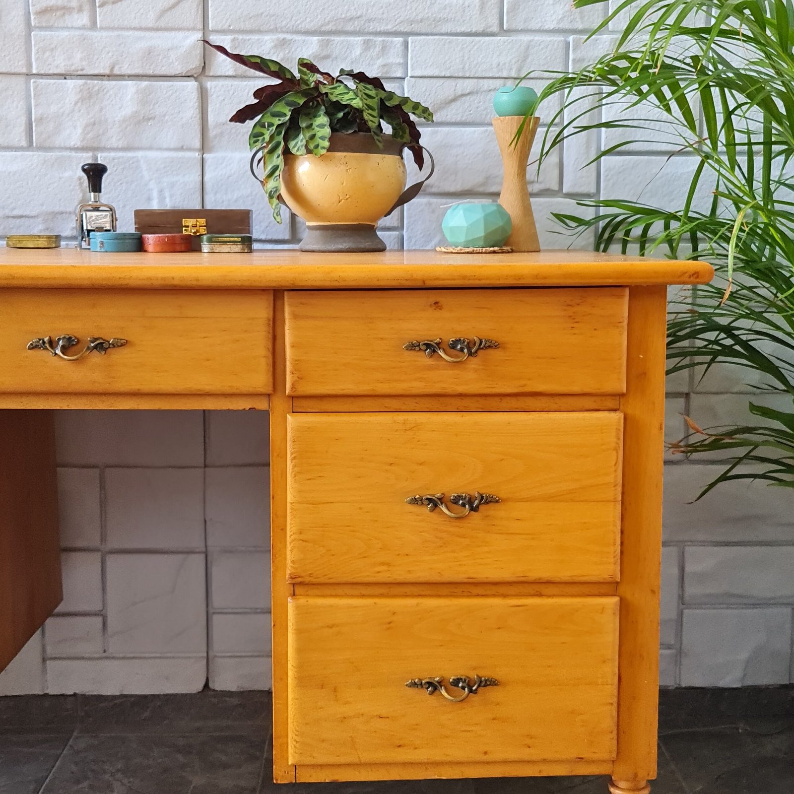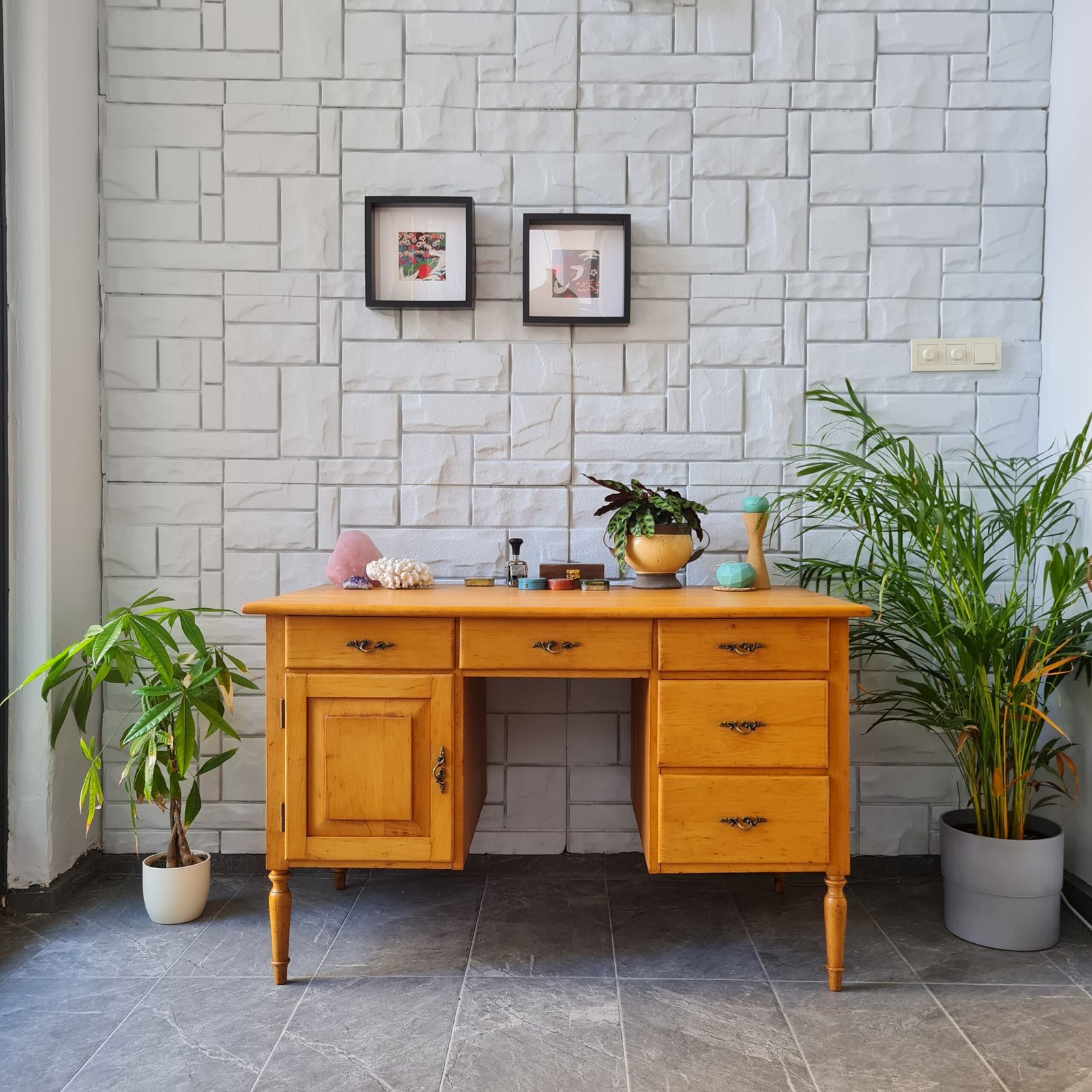 1970’lerde üretilmiş masif meşe çalışma masası, doğal dokusunu koruyarak estetik bir görünüm sunuyor.