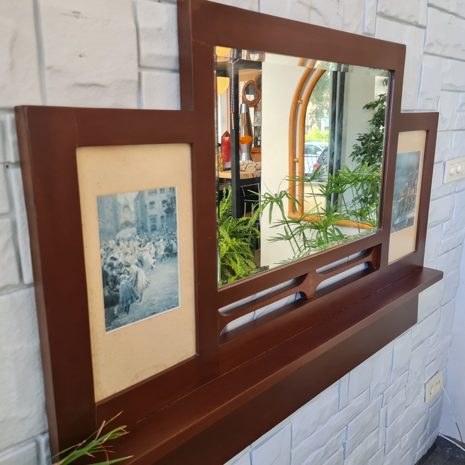 XIX. yüzyılın sonlarında üretilmiş, zamanın estetik anlayışını gözler önüne seren raflı ayna. Masif ceviz bu şık parça, dekorasyonunuza tarihi bir dokunuş katacak.